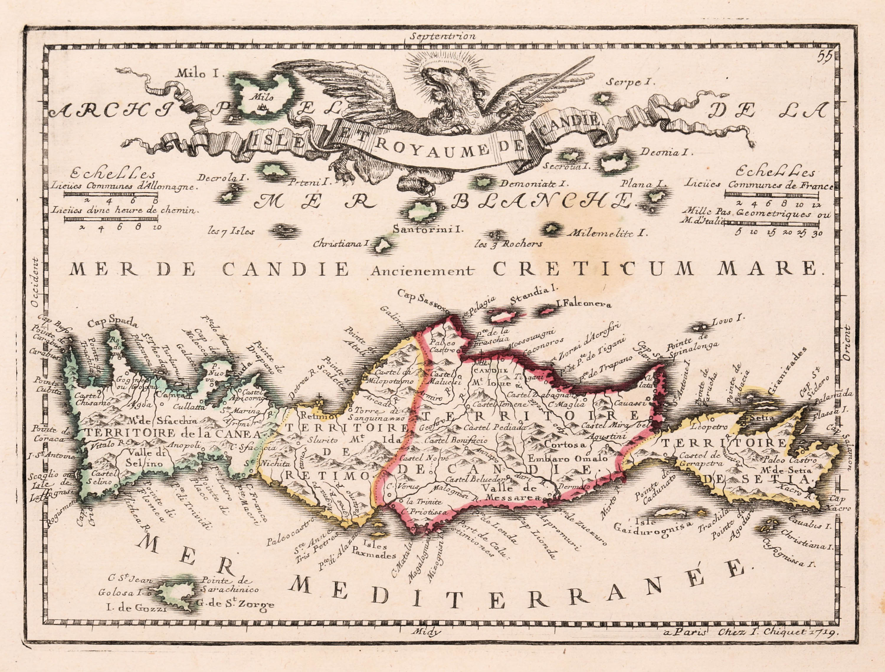 Mapa Krety, Paryż, 1719dwa arkusze: 1. Mapa, 2. Opis w języku francuskimmiedzioryt kolorowany w epoce, 16,8 x 22,5 cm (odcisk płyty)stan zachowania dobry +, nieduża brązowa plama