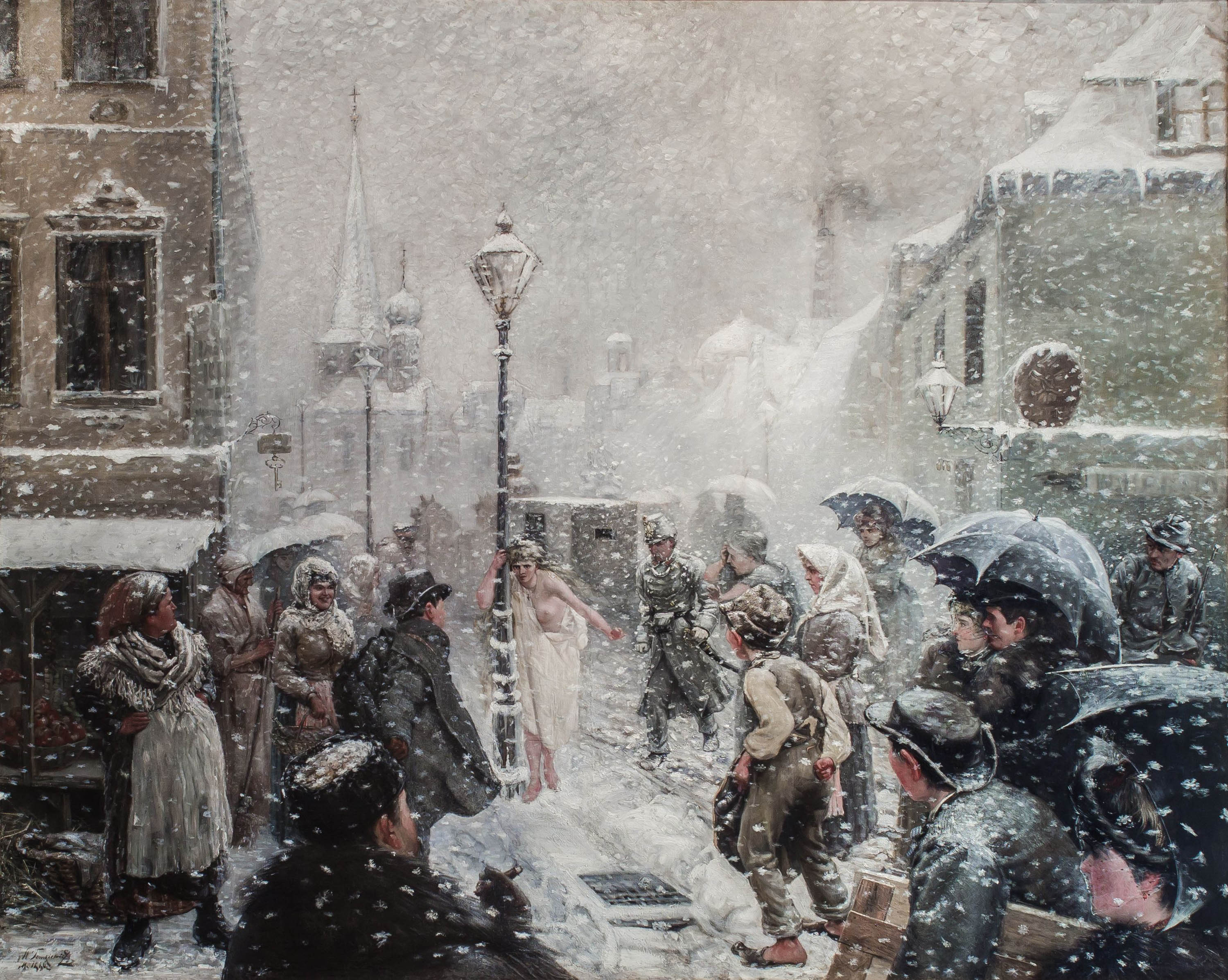 Autor opuścił polski obszar imaginacyjny na rzecz sceny miejskiej, obcej w dużym stopniu malarstwu polskiemu. (…) namalował po prostu scenę rodzajową, stworzył plastyczny zapis banalnego, nie w sensie pejoratywnym, wydarzenia ulicznego, najpewniej autentycznego. Zrobił to w mistrzowski sposób. Świetnie przedstawił i indywidualnie scharakteryzował gapiów, którzy reprezentują sobą cały przekrój ówczesnego społeczeństwa (…).