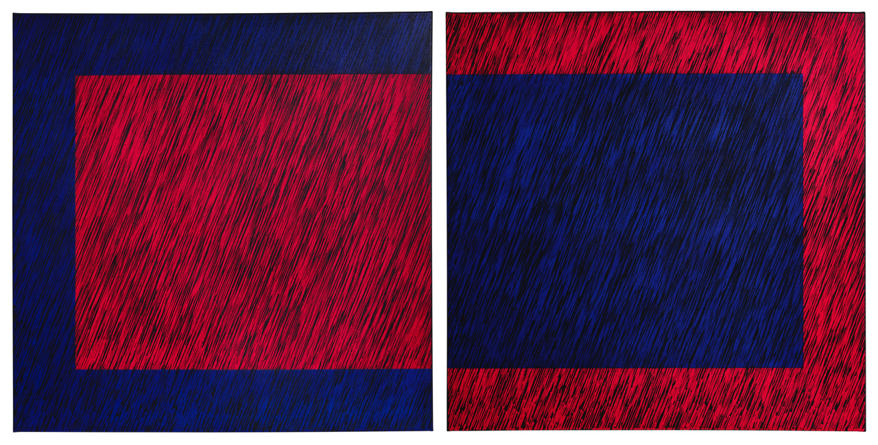 Akryl/technika własna/płótno.Dyptyk - 2 prace, każda o wymiarze 100x100 cm,sygnowany, opisany, datowany na odwrociu: ' Jesteś moim uzupełnieniem, 2021, Joanna Głażewska'