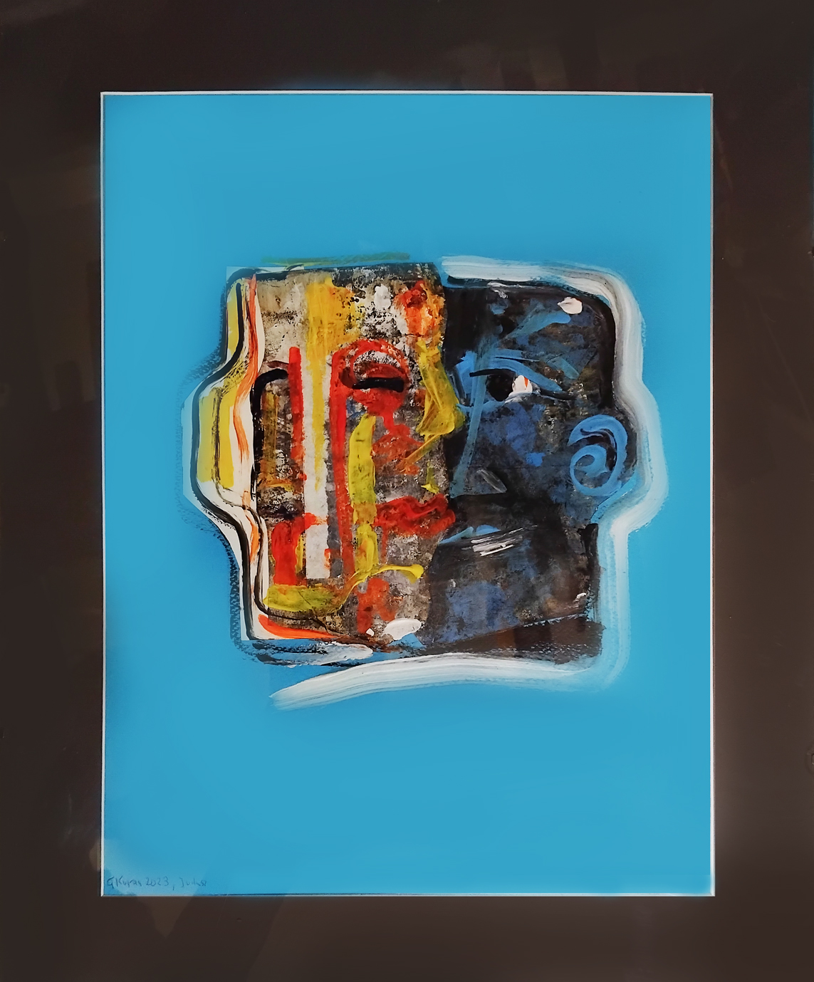 technika mieszana (akryl, węgiel, kolaż), papier, 40 x 30 cm, w oprawie: 50 x 40 cm,
