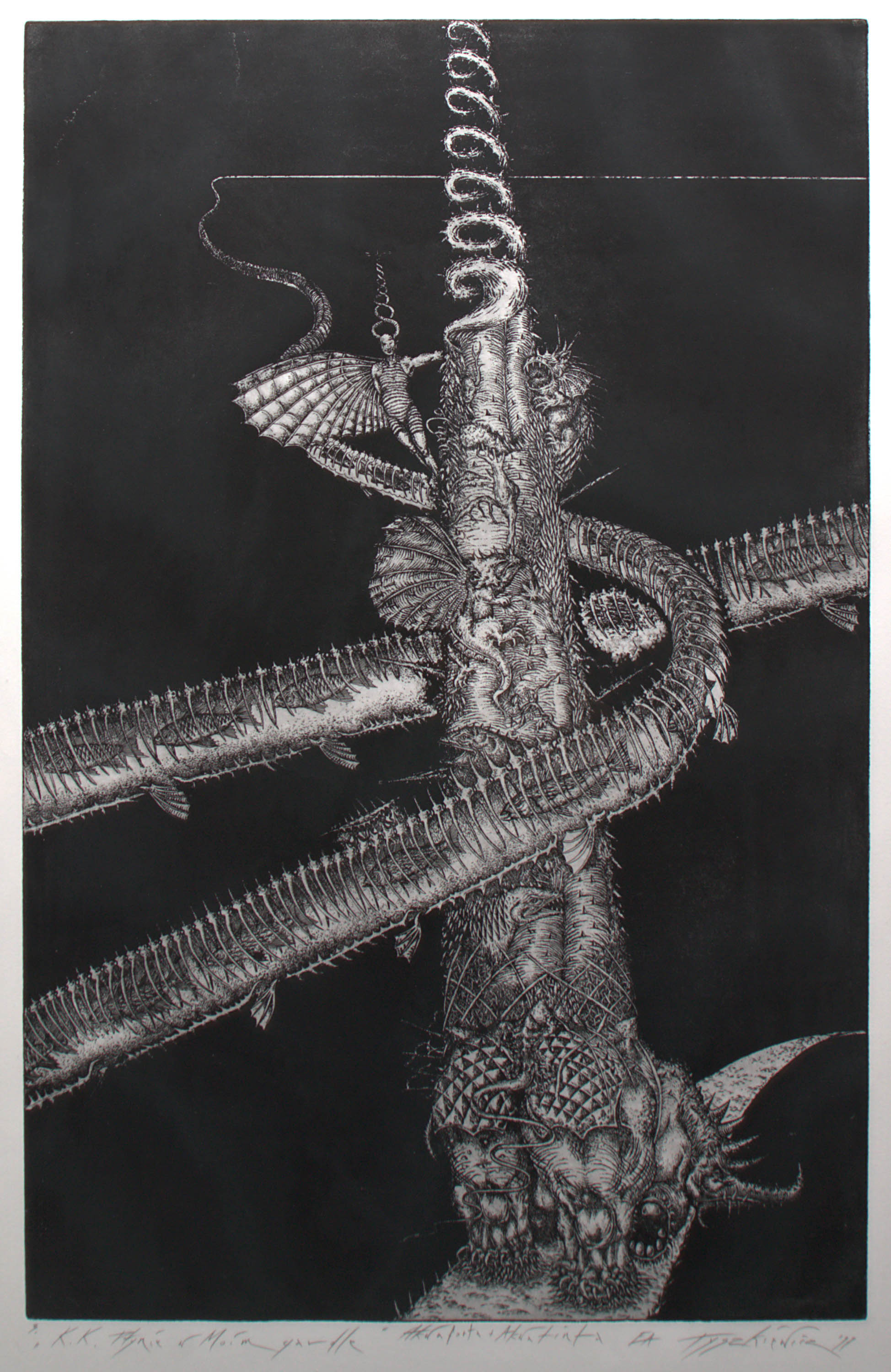 akwaforta, akwatinta, papier, 74,5 × 49 cm (odcisk płyty)sygn. i dat. p. d. ołówkiem: Tyszkiewicz’97, opis. u dołu ołówkiem: 3. "K.K. Płynie w Moim gardle” Akwaforta + Akwatinta EA