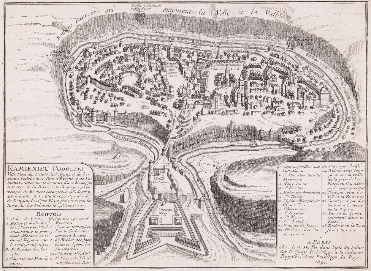 A Paris Chez le Sr De Fer dans l'Isle du Palais Sur le Quay de l'Orloge a la Sphere Royale. Avec Privilege du Roy, 1691; KAMIENIEC PODOLSKI| Ville Forte des Etats de Pologne, et de |a Haute Podolie avec Titre d`Evéché et de Palatinat. Situé Sur le Sammet d`une Montagne entourée de la Riviere de Smotrycz et en velopée de Rochers escarpez a 48. Degre| 45 minutes de Latitude et 50. deg. 10. mins.| de Longitude. Cette Place fut prise par les Turcs Sur Polonois le 20.e Aoust 1672.