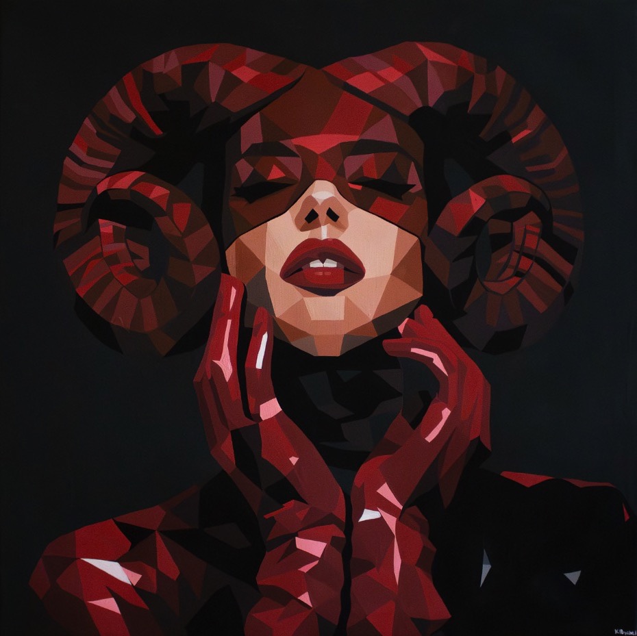 Praca inspirowana fotografią Albiny Didovich o tytule "ARIES z serii Latex Zodiac Series".