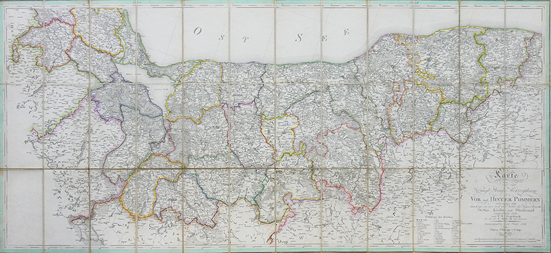 Szczegółowa mapa Pomorza, wyd. Simon Schropp & Comp., Berlin 1822miedzioryt kolorowany liniowo w epoce, papier naklejony na płótno, 53,5 x 117,3 cm