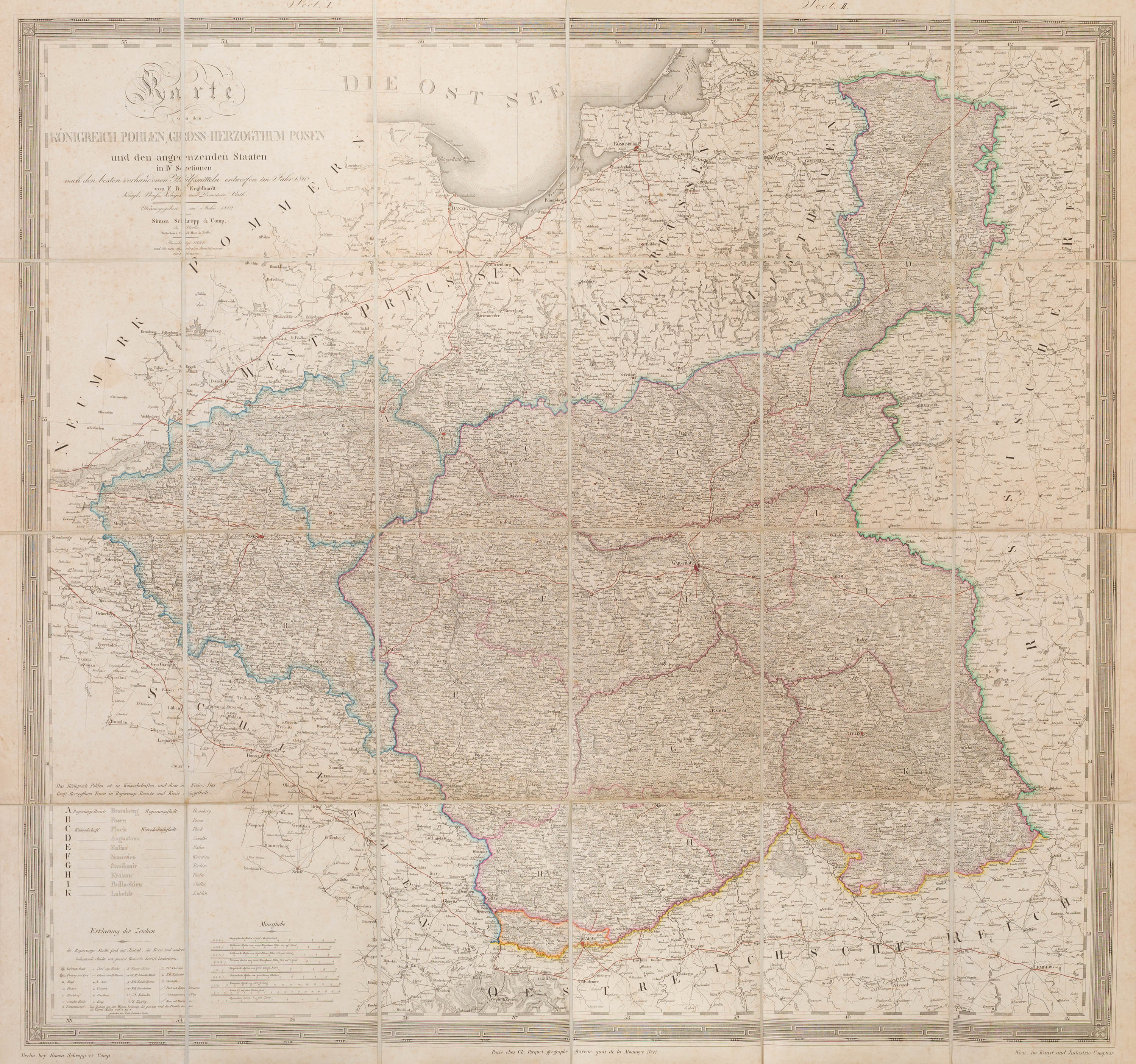 Mapa ziem Rzeczpospolitej, wyd. Simon Schropp, Berlin 1831 litografia kolorowana liniowo w epoce, papier naklejony na płótno, wym. całk. 92 x 97 cm stan zachowania bardzo dobry