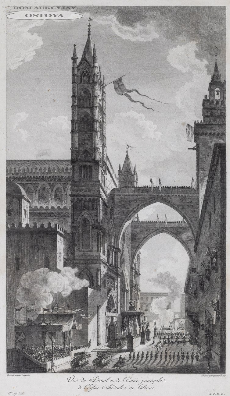 Sygnowany z płyty pod ryciną: Dessinee par Deprez Gravee par Quauvilliers / Vuë du Portail et de l'Entrée principale de l'Église Cathédrale de Palerme