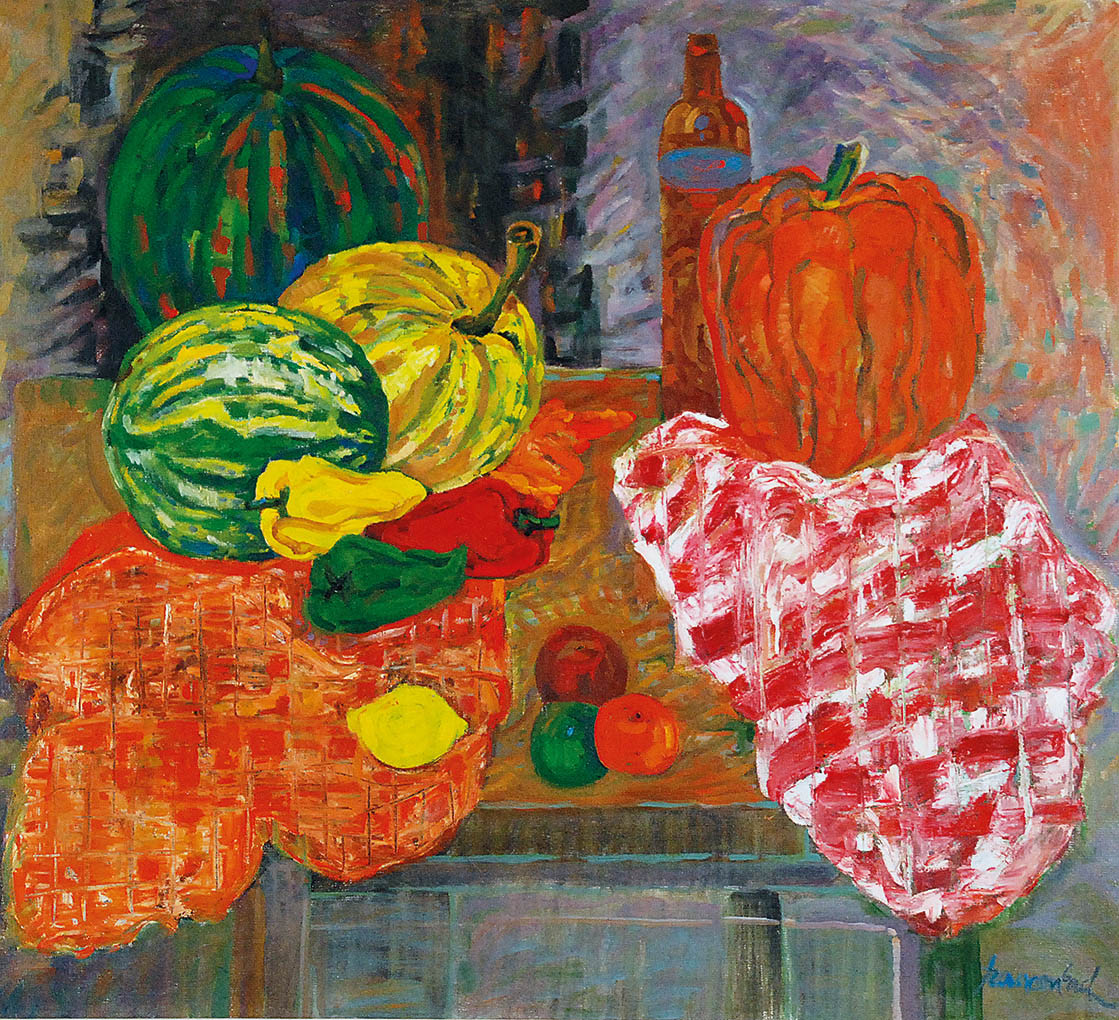 olej, płótno; 85 x 95 cm;sygn. p. d.: Szancenbach;na odwrocie opis autorski: JAN SZANCENBACH / KAWONY I DYNIA II / 1988.