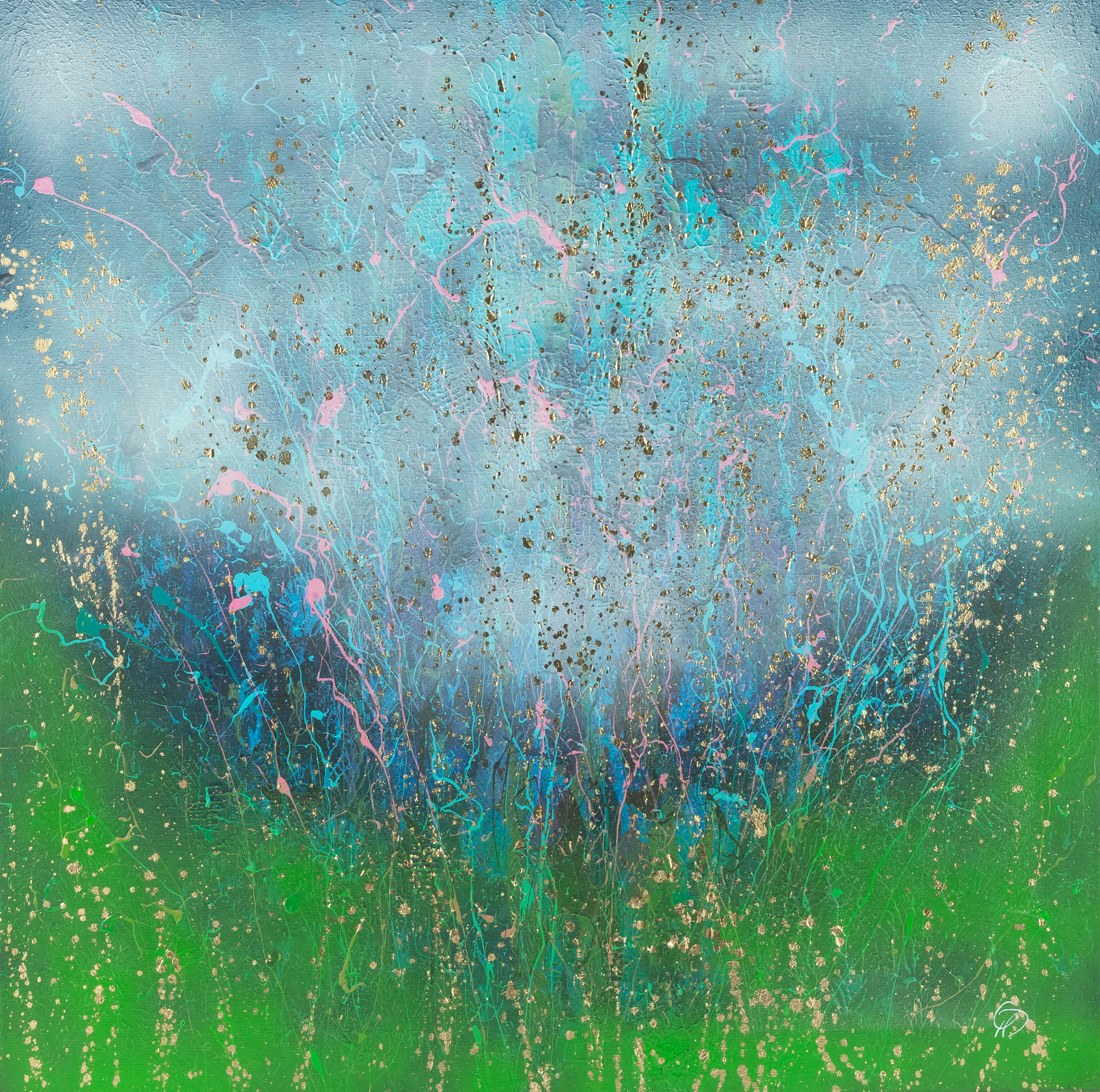 akryl, farba metaliczna, płótno, 80 x 80 cm,sygn. monogramem p.d.: MD, opisany, dat. i sygn.: Kiedy budzi się dzień / 2025 / Marta Dunal