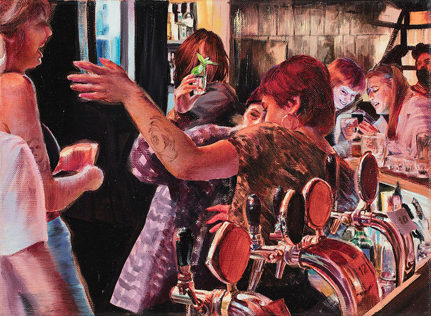Do tego typu dzieł należy prezentowany „Kieł” z 2021 roku, ukazujący zatłoczoną przestrzeń pubu. Za barem z rzędem kranów stoi roześmiane towarzystwo prezentując kieliszek z soczyście zieloną rośliną. Jakieś dziewczyny siedzące nieopodal przy barze zajęte są komentowaniem tego, co oglądają w smartphonie. Wszystkich spowija sztuczne, czerwone światło, nadając scenie lekko odrealniony charakter. Zatrzymany na obrazie moment wydaje się świecić jakby od wewnątrz – blaskiem imprezowego wieczoru, a postacie i przedmioty odmalowane bez większego detalu, zacierają się niczym widmo pamięci.