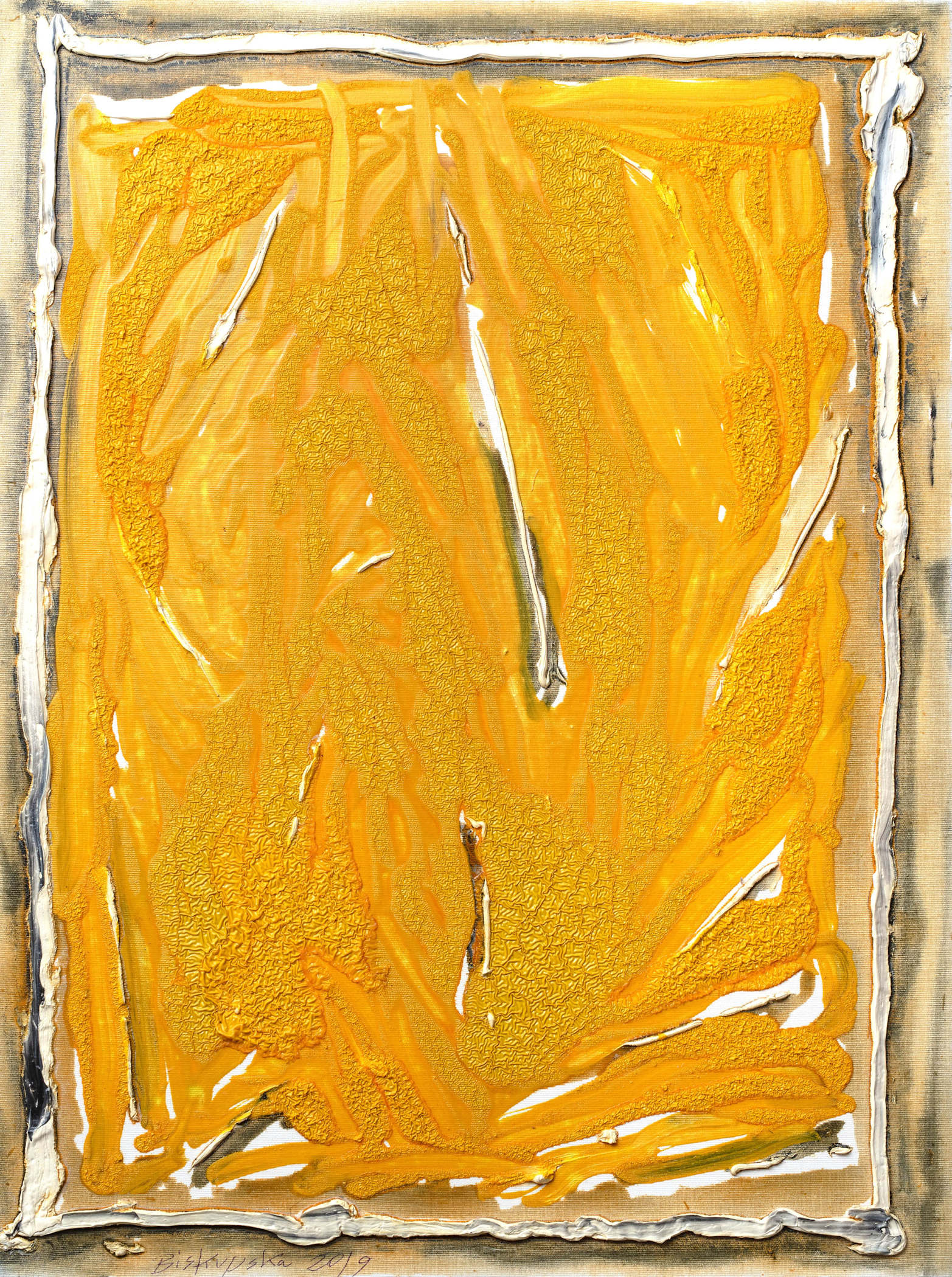 sygnowany i datowany l. d.: 'Biskupska 2019'; opisany na odwrocie: 'Bożenna | Biskupska | KLATKA VI | olej płótno | 60 x 80 | 2019'