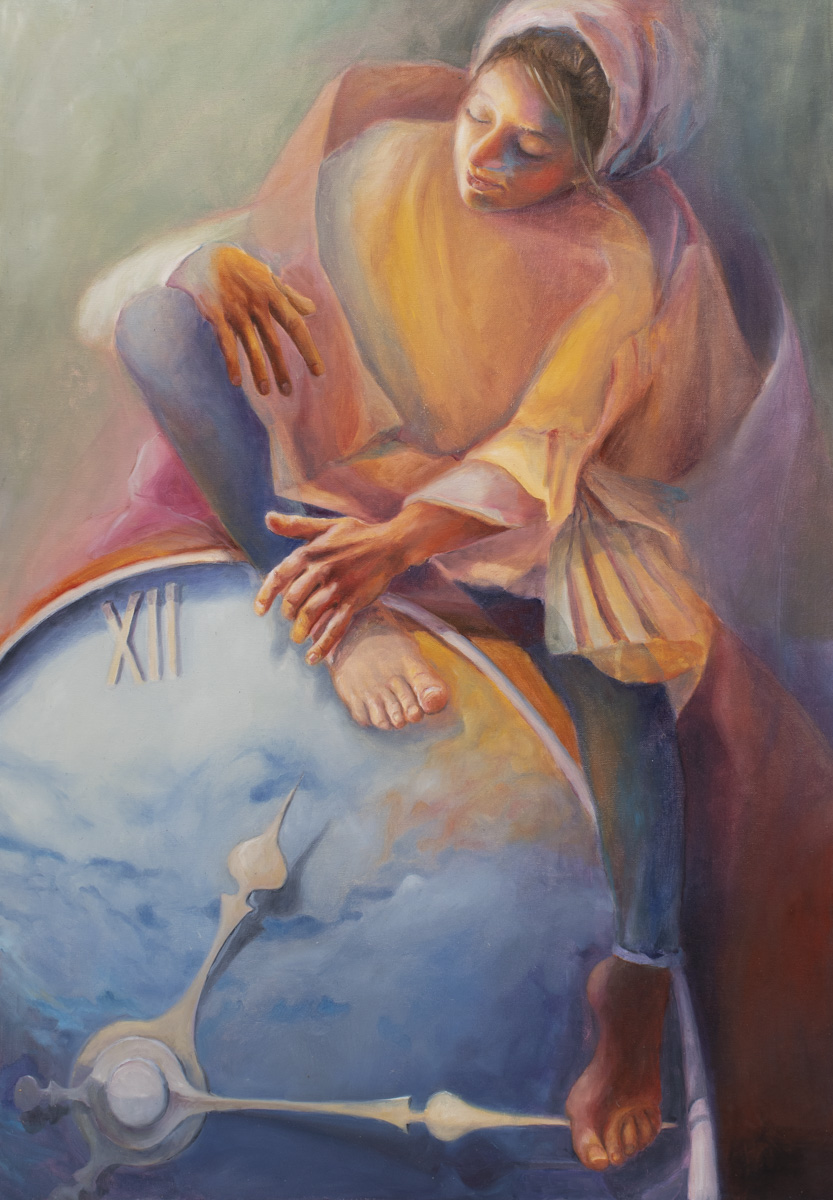 olej, płótno, 100x70 cm, opisany na odwrocie: "KOBIETA NA CZASIE" 2020 Iwona Duda