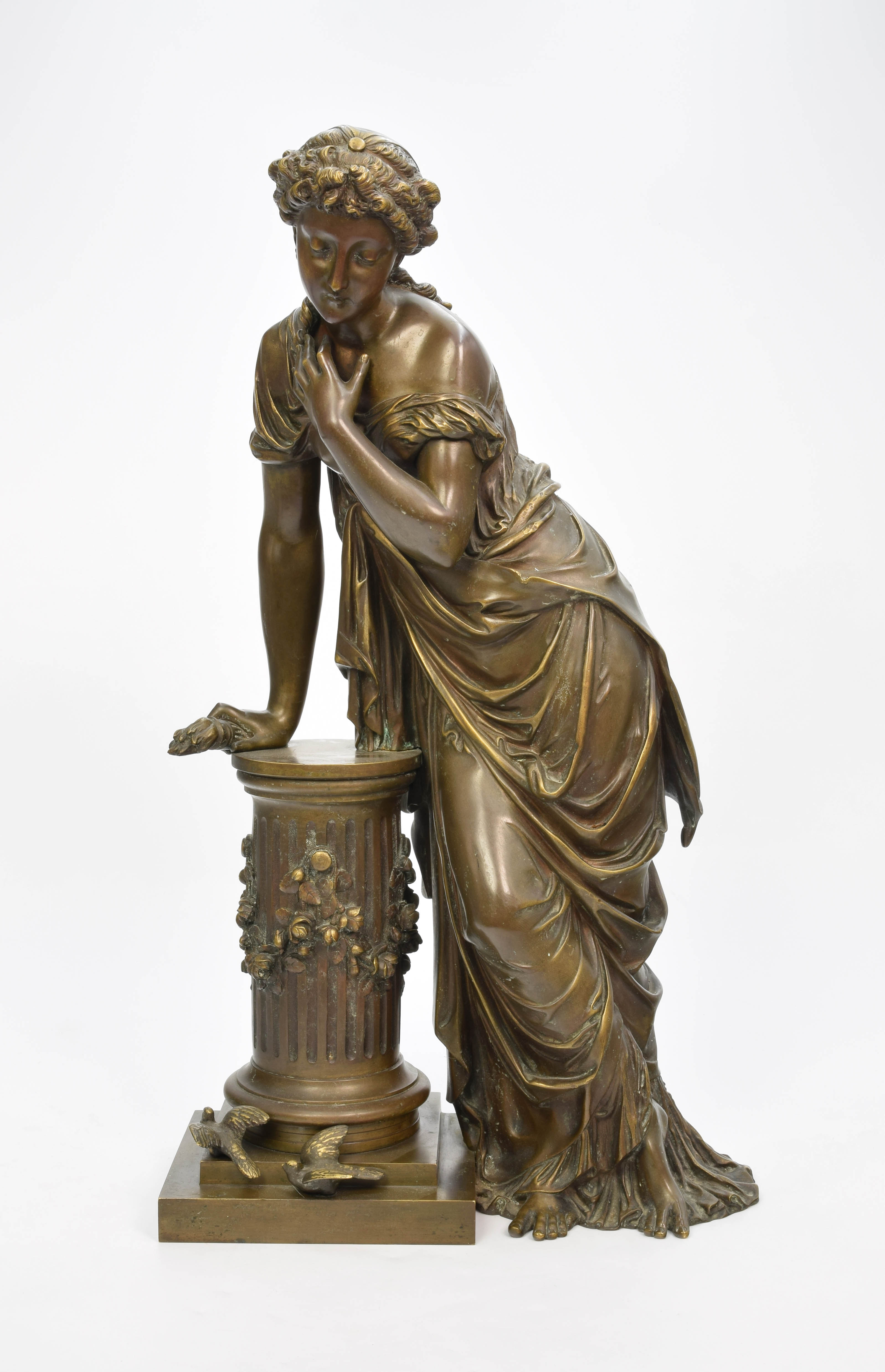 Postać młodej kobiety w antycznych szatach, pochylonej nad ołtarzem w formie kanelowanej kolumny oplecionej girlandą; w ręku trzyma pochodnię; u stóp ołtarza przysiadła para gołąbków przeznaczonych na ofiarę. W starożytności gołębie poświęcone były bogini Afrodycie (Wenus) jako symbol niewinności i miłości; kobiety ofiarowując je bogini - prosiły o szczęście i płodność w miłości i małżeństwie. Sygn. z boku na podstawie: „scpt. / Detrier”.