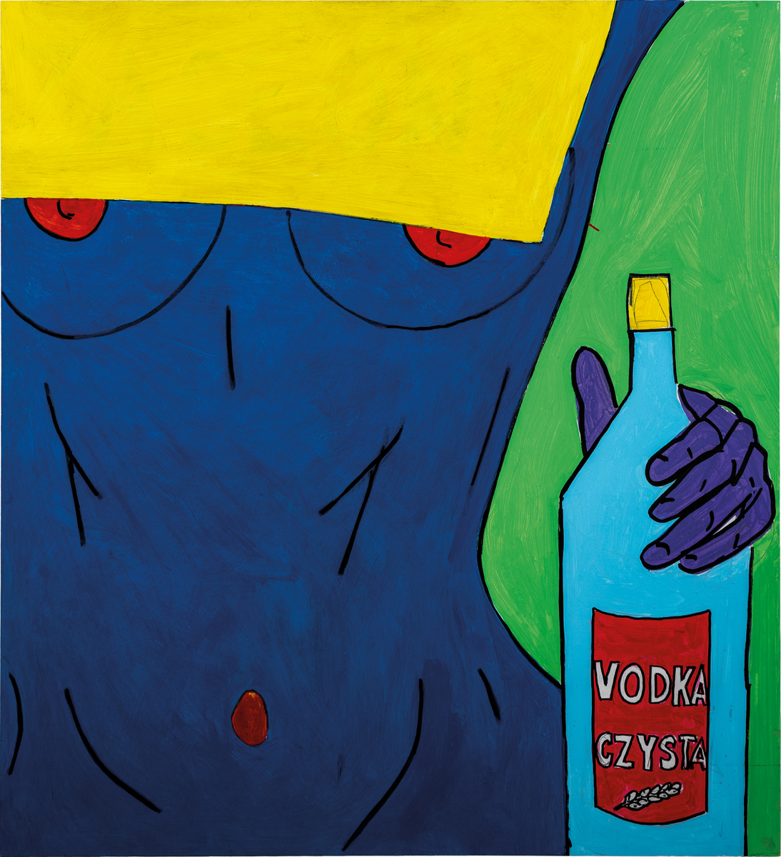 Obraz „Kobieta z butelką” z serii powstałej w roku 2017, mieszczącej się w konwencji zestawień nasyconych pop-artowskich kolorów i podziałów o uproszczonym konturowym rysunku. Charakterystyczna dla autora umiejętność szczególnej fragmentaryzacji - kadrowania spersonifikowanych scen, nadaje nowych treści warstwom znaczeniowym obrazu.