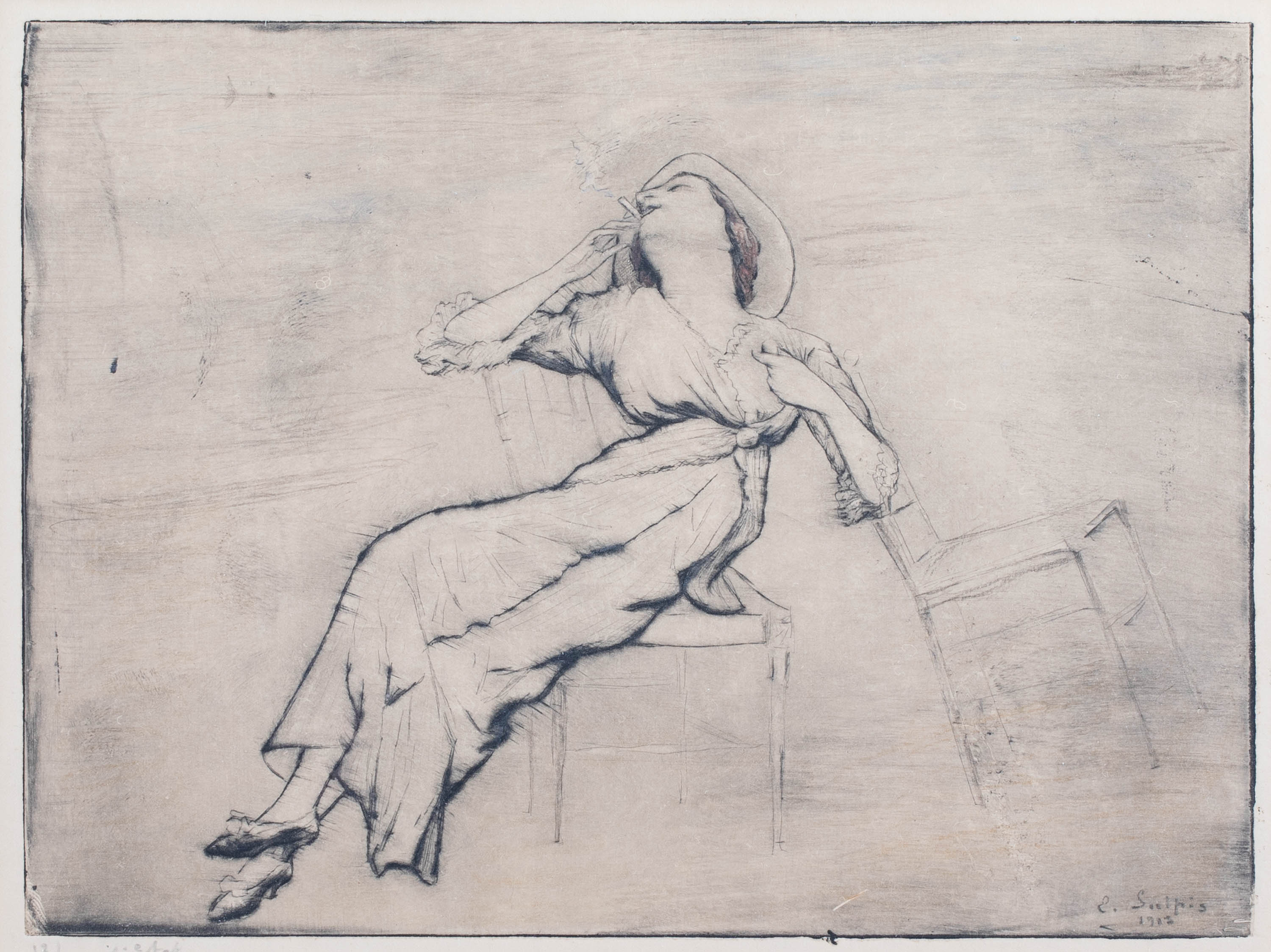 sucha igła, papier, 15 × 20 cm w świetle passe-partoutsygn. i dat. p. d. na płycie: E. Sulpis/1912opis. ołówkiem l. d.: 13/19, dalej nieczytelnie