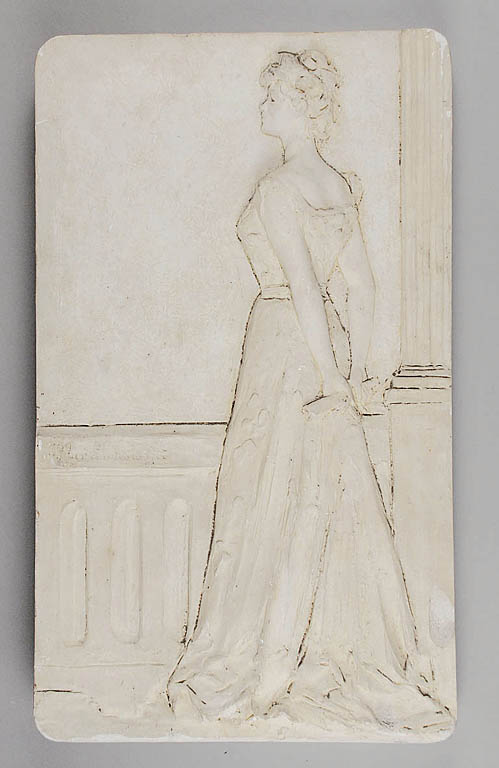 Płasko rze¼biona płyta przedstawia wpatrzoną w dal młoda kobietę w stroju wieczorowym - długiej sukni z odkrytymi plecami - trzymającą złożony wachlarz, stojącą w loggii ujętej fragmentem kolumny i balustradą.