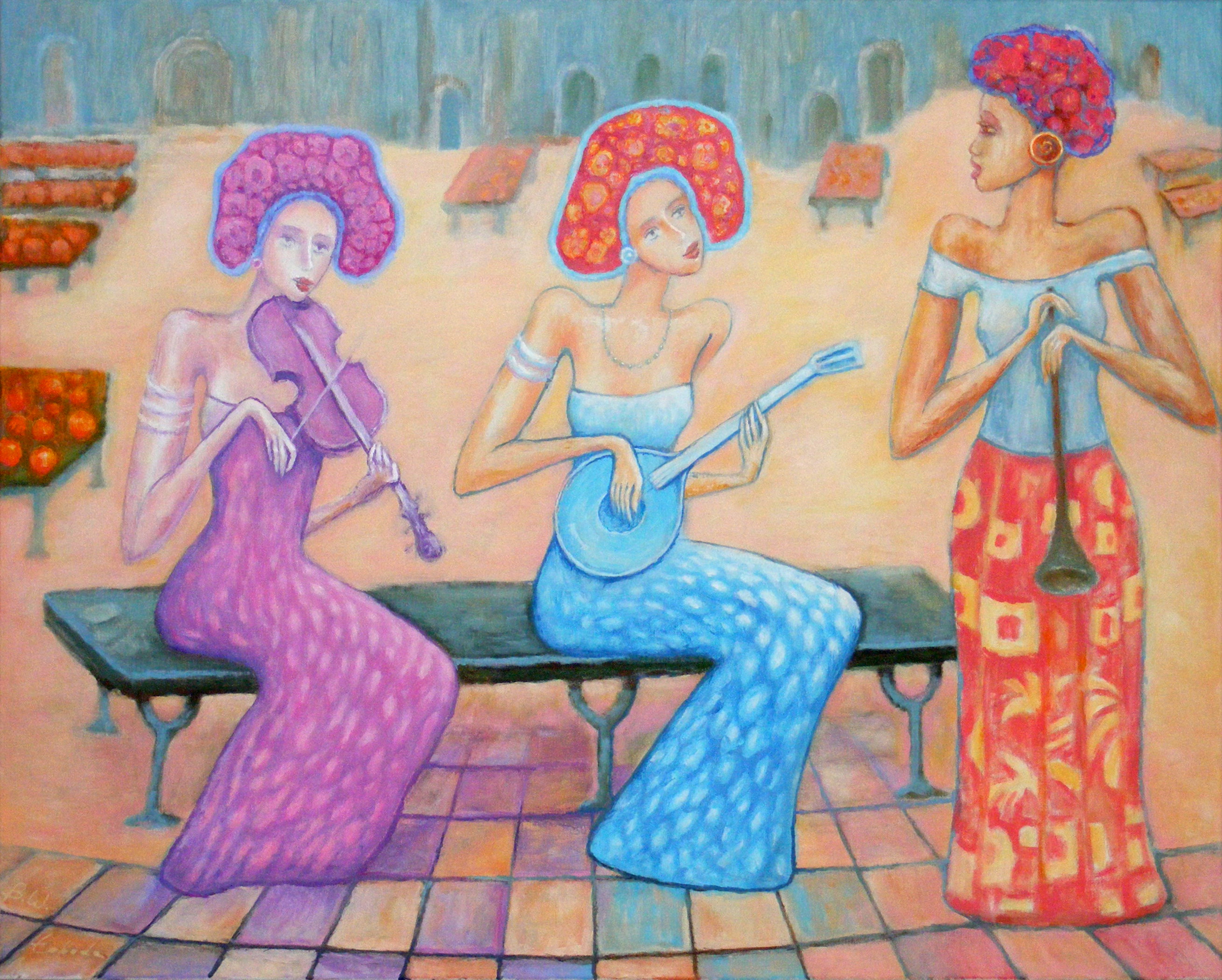 Ostatnio maluje obrazy, w których „pojawiają się” bajkowe postaci i sytuacje zaczerpnięte ze spektakli teatralnych, do których robił scenografię.