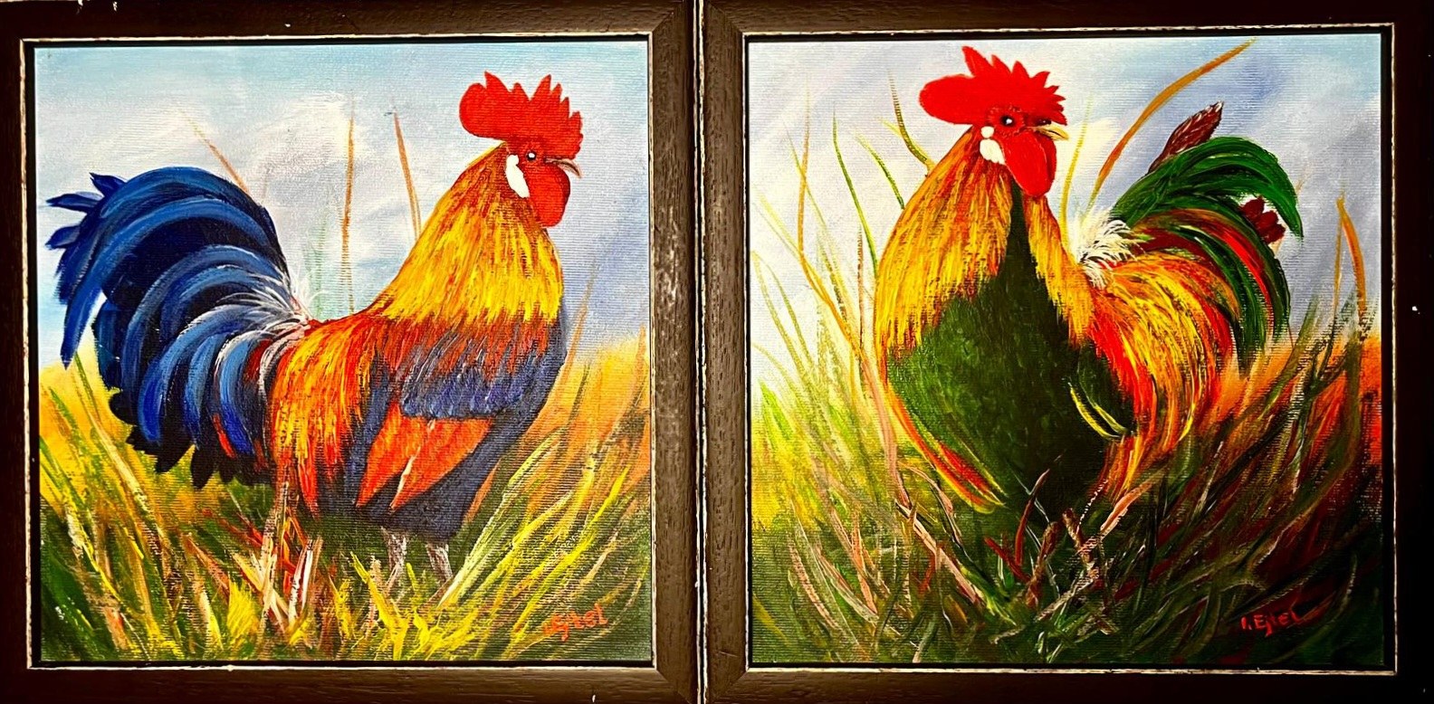 Oryginalny obraz przedstawiający koguta, wykonany farbami akrylowymi na płótnie. Kompozycja o silnym wyrazie kolorystycznym, utrzymana w intensywnej, kontrastowej gamie barw. Praca oprawiona w elegancką, ciemną ramę i gotowa do ekspozycji.