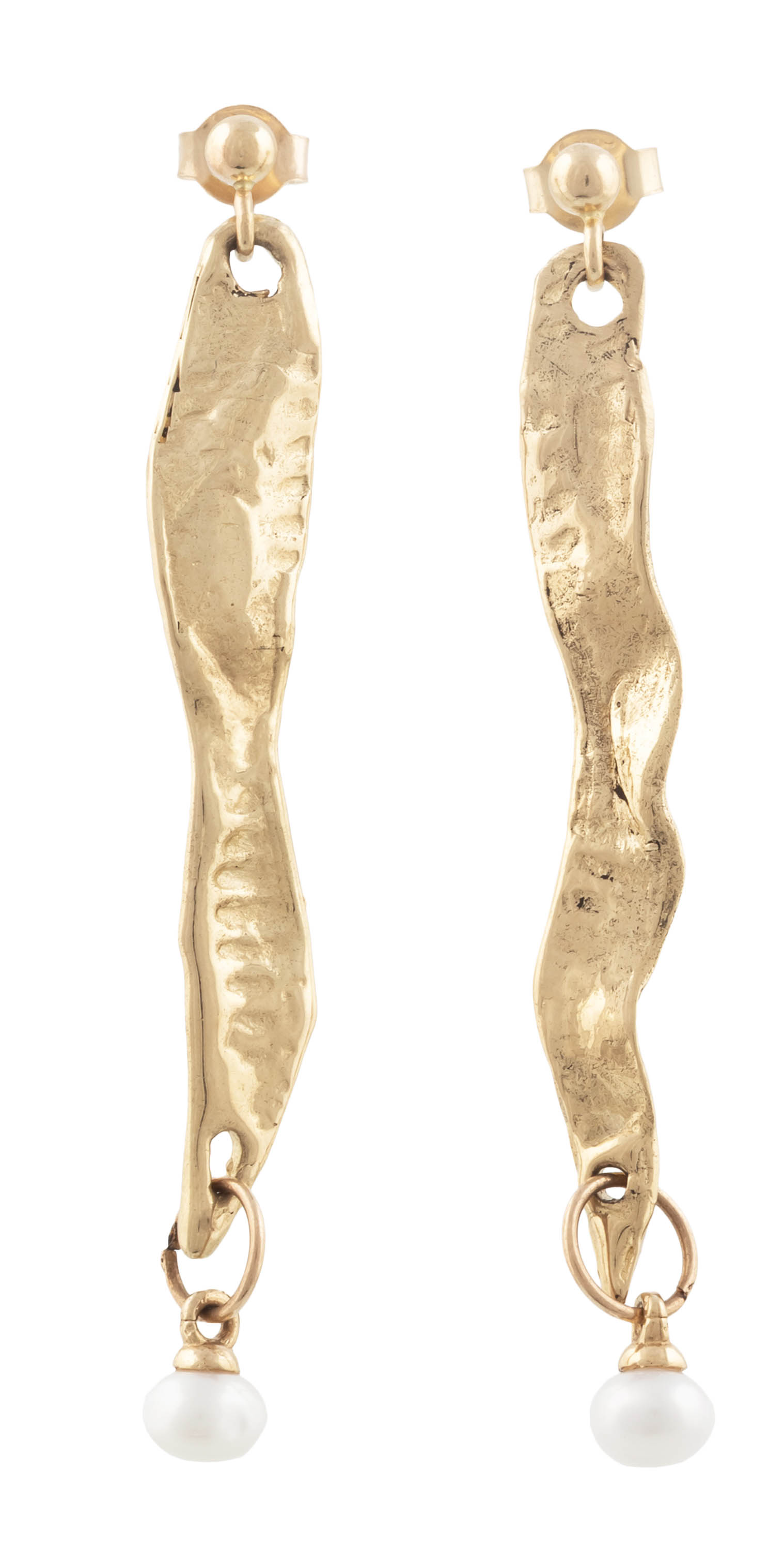 złoto, pr. ok. 0,585, m. 6,4 g, 2 szt. pereł hodowanych słodkowodnych, dł. 5,5 cmProjekt autorski, jedyny egzemplarz.