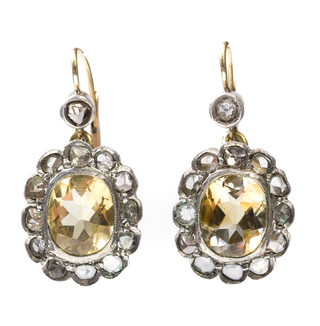 złoto pr. ~ 0,585, srebro; 2 cytryny fasetowane, rozety diamentowe, masa: 7,79 g; wym.: 3,0 x 1,5 cm
