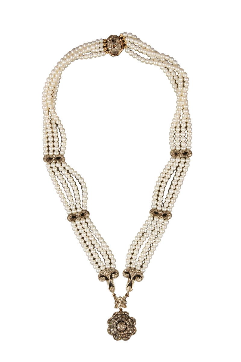 złoto, pr. 0,750, m. 53,49 g, 177 szt. diamentów łącznie ok. 1,80 ct, P1/J-K, nowy szlif, perły hodowane