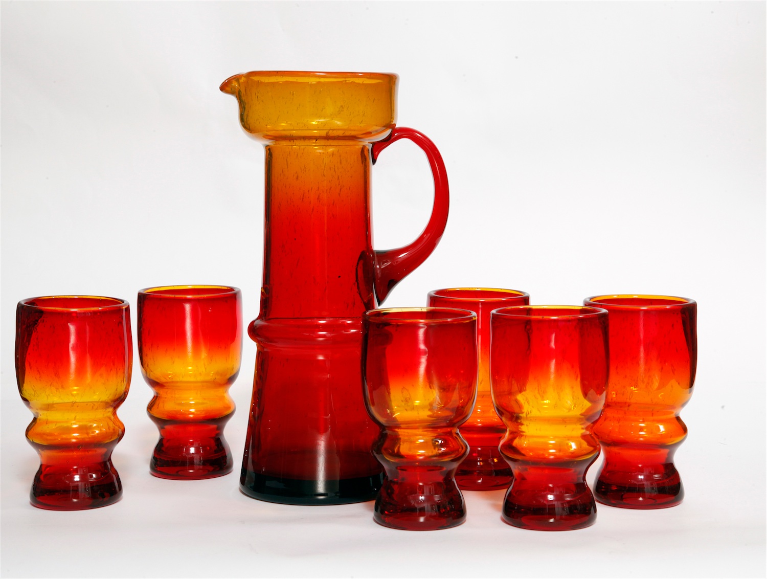 dzban i sześć szklanek,Polska, lata 70. XX w.;szkło w typie antico, barwione w masie, gradacja kolorów;wym. dzban: wys.: 26,5 cm., szklanki:12,5 cm.