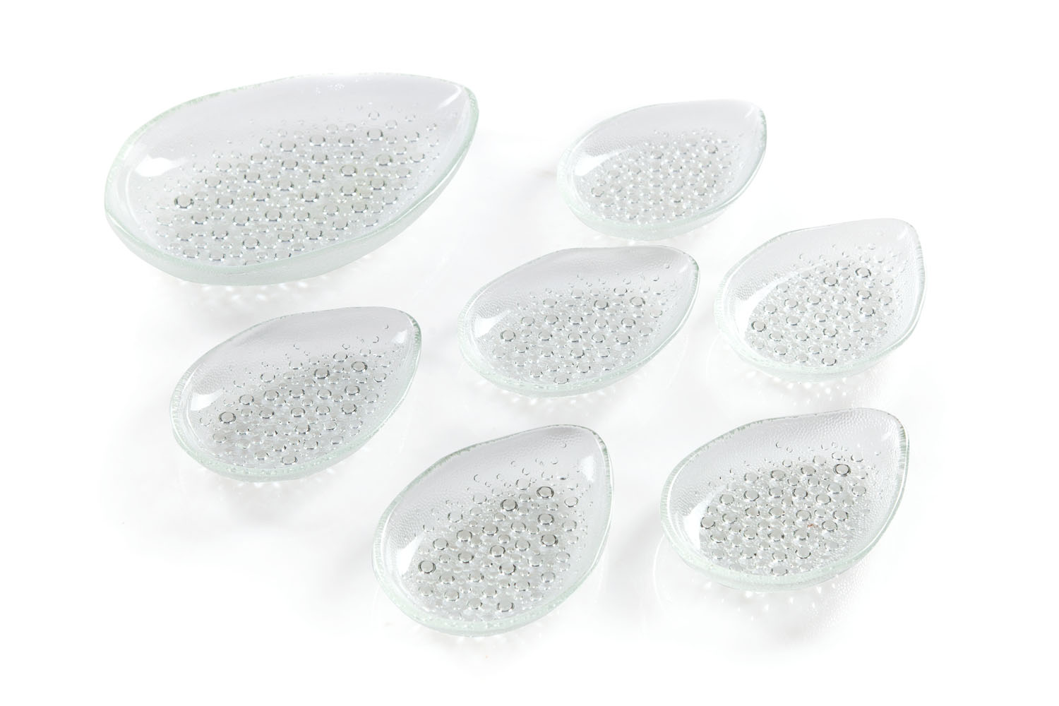 szkło prasowane; duża salaterka (4 x 15 x 23 cm), 6 małych salaterek (3 x 10 x 15 cm);Huta Szkła Gospodarczego Ząbkowice w Dąbrowie Górniczej, lata 70. XX w.