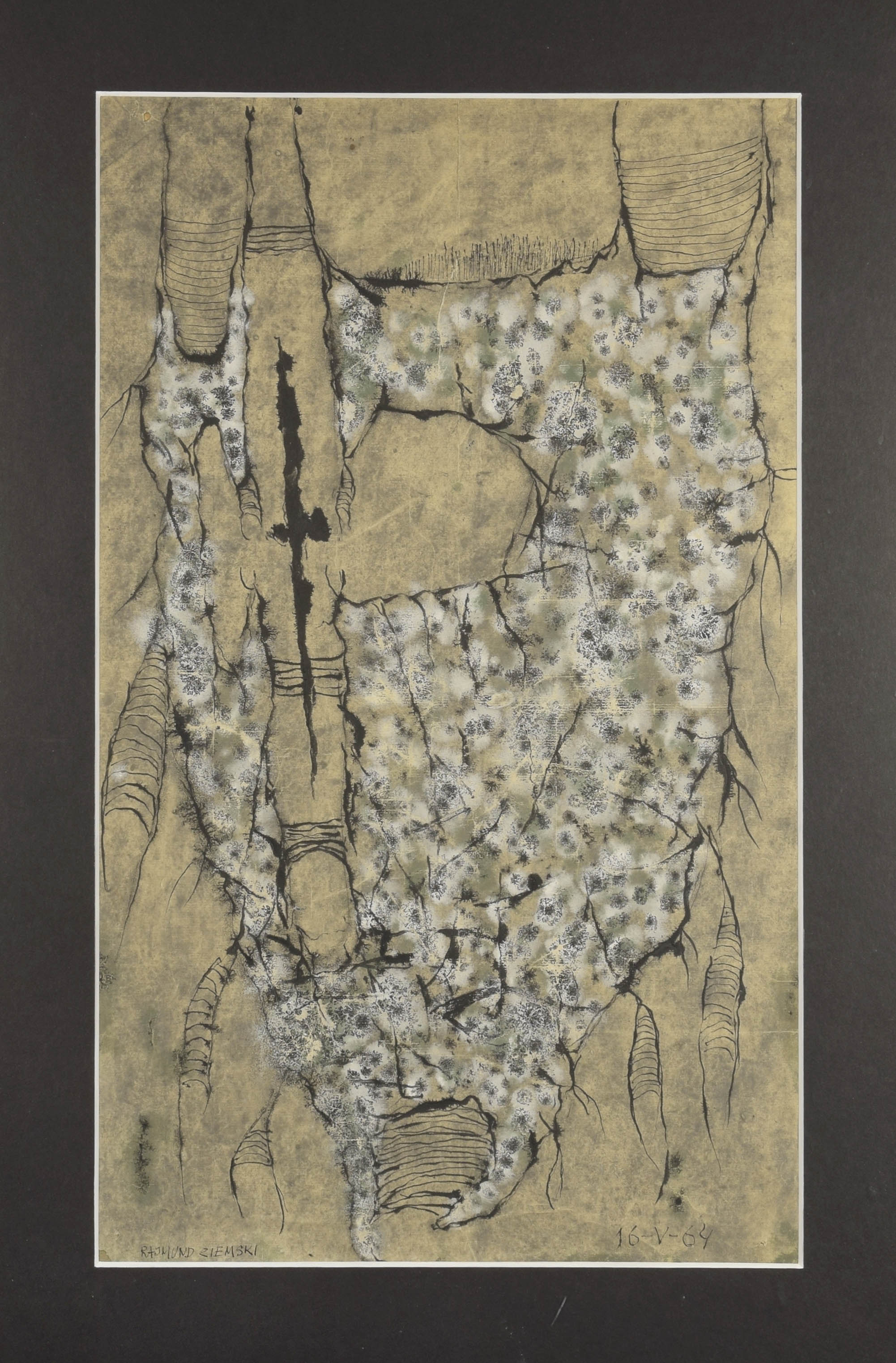 tusz, akwarela, gwasz, papier; 61,5 x 37,5 cm (w świetle passe-partout);sygn. l. d.: RAJMUND ZIEMSKI, p. d. dat.: 16-V-64.