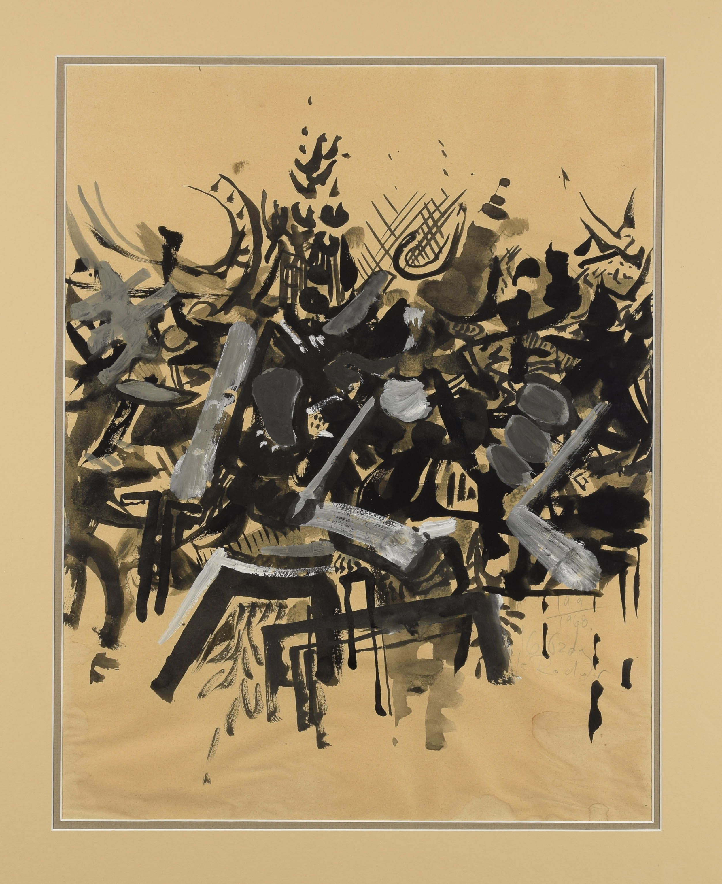 gwasz, papier; 44,5 x 34,5 cm (w świetle passe-partout);sygn., dat. i opisany przy prawej krawędzi, pośrodku: 19.9 / 1968 / Kobzdej / … (ołówkiem).