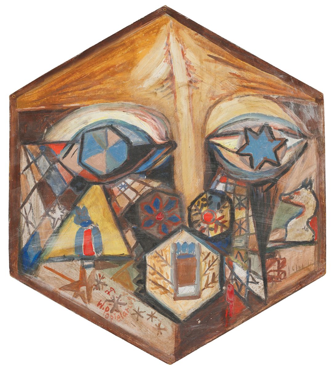 Gwasz, olej, pilśnia; 54 x 47,5 cm (sześciokąt)