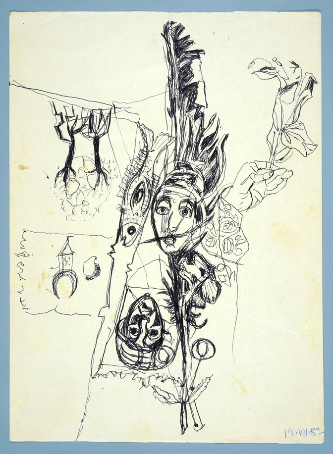 czarny długopis, papier, 29,2 x 21,2 cm; dat. p. d.: 14. VII. 82 (niebieskim długopisem) Na odwrocie odręczny napis: Jadwiga Muszanka / Łakomska - Jedna z ostatnich prac / Artystki (ołówkiem)