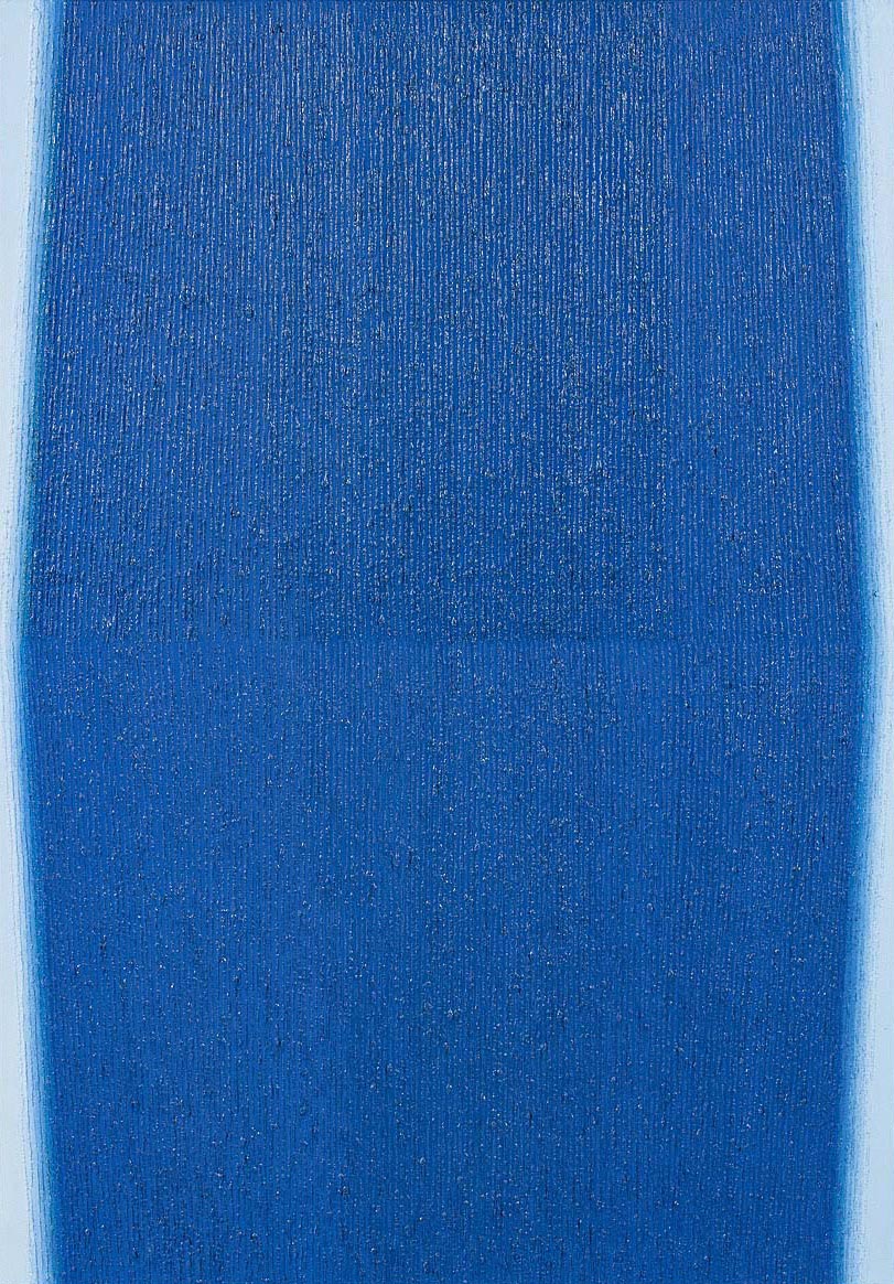 Malarstwo Doroty Grynczel było dla niej polem do eksploracji tematu przestrzeni i światła. Skrupulatnie i z wielkim zamiłowaniem do precyzji tworzyła prace, które cechuje mnogość złudzeń optycznych i wrażenie wciągającej głębi. Perfekcjonizm w dążeniu do doskonałości objawia się w szczegółowo opracowywanej powierzchni obrazu. Forma wiedzie tu prymat nad kolorem, choć ten nigdy nie był dla Grynczel sprawą obojętną a narzędziem. Umiejętne wykorzystywanie tonacji barw było jednym ze sposobów konstruowania przestrzeni. Błękit zdominował malarstwo artystki od lat 80. O błękicie mówiła, że to kolor bez początku i bez końca, nie znający granic. Potrafiła tak różnicować jego natężenie, że monochromatyczne kompozycje żyły – pulsowały, falowały, wychodziły poza obszar płótna. W oferowanej kompozycji intensywny kobaltowy błękit dominuje obraz. Kolor stopniowo blednie dopiero na krawędzi kompozycji. Zanika zupełnie pozostawiając białe brzegi płótna. Pozioma oś tworzy symetryczną figurę dwóch połączonych ze sobą dłuższym bokiem trapezów, zorientowanych względem siebie jak w lustrzanym odbiciu. Harmonię formy podkreśla charakterystyczne dla Grynczel opracowanie warstwy malarskiej, która dzięki pionowym liniom żłobkowania daje wrażenie ruchu. Abstrakcyjne malarstwo Doroty Grynczel w szerokim ujęciu wpisuje się w kontynuację poszukiwań op-artowskich. Artystka, której drugi dziedziną działalności była tkanina artystyczna, ze szczególną wrażliwością kładzie nacisk na fakturę i jej rolę w budowaniu przestrzeni.