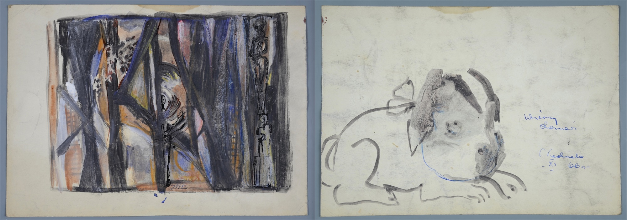 na odwrocie leżący pies (z wpisaną głową mężczyzny - tusz lawowany), obok z prawej napis piórem Wierny / domowi / Niedziela / - XI 66 r.