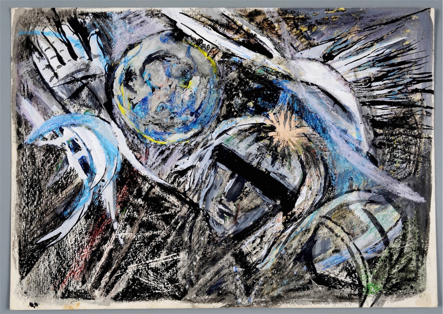 kredki świecowe, gwasz, tusz, collage, karton, 23 x 32,5 cm;