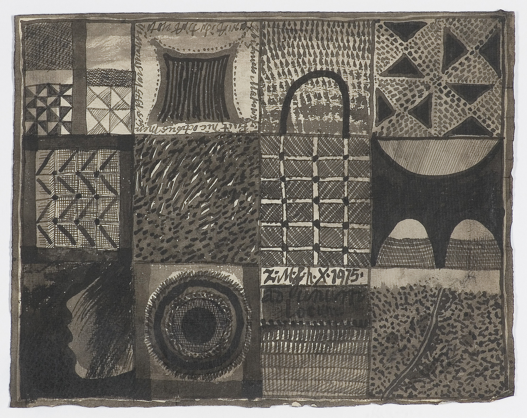 sygn. l.g. na obrzeżach kwadratu, od l.g. rogu: Zbigniew Makowski | Pixit hic octobris men | sis 1975 Varsovia [nieczyt.] | [wiersz u g. nieczyt.], na innym kwadracie p.d.: Z. M. fh. [?] X. 1975.