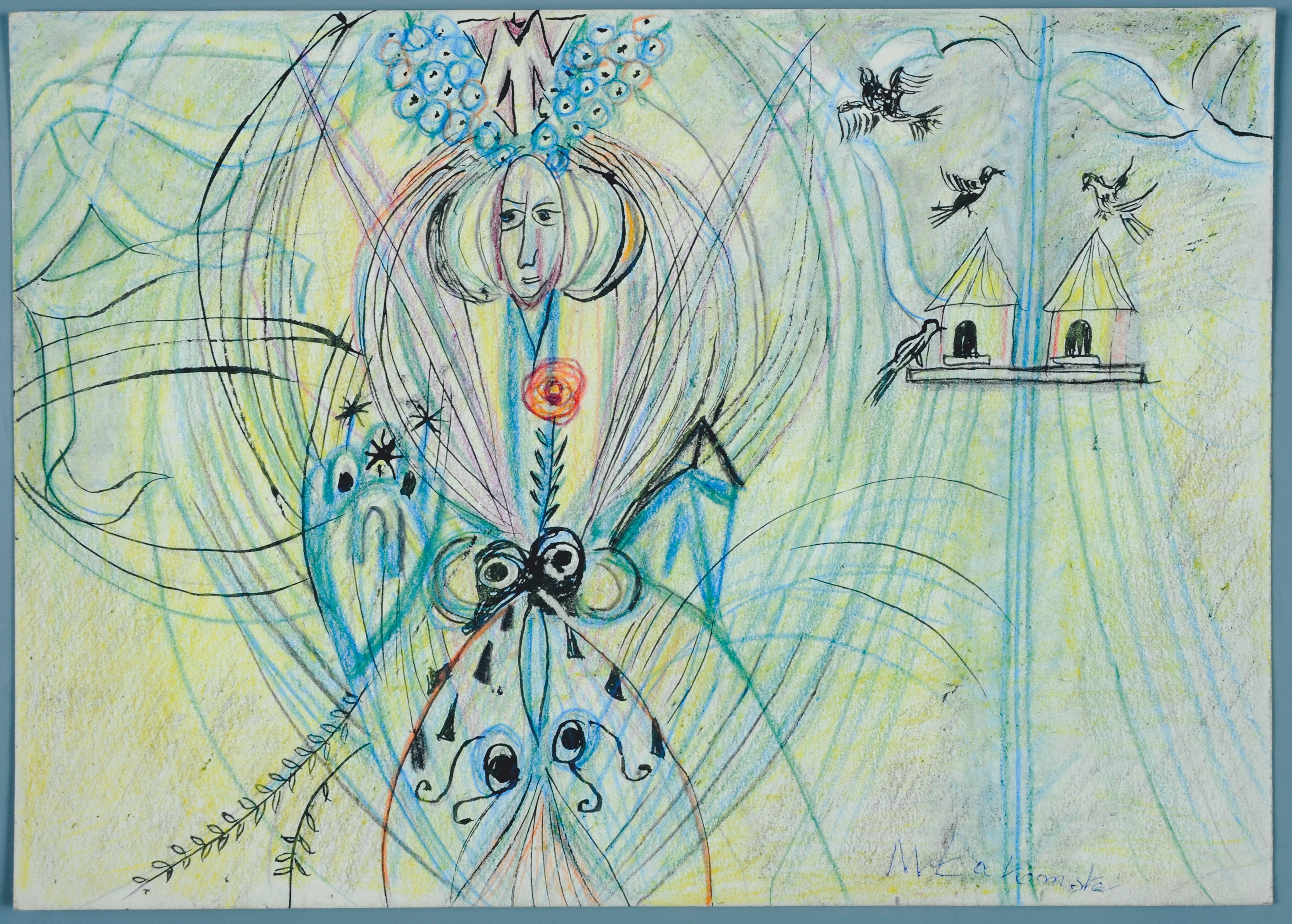 kredki, tusz; karton; 23 x 32,5 cm;sygnowana u dołu z prawej: M Łakomska (długopisem).