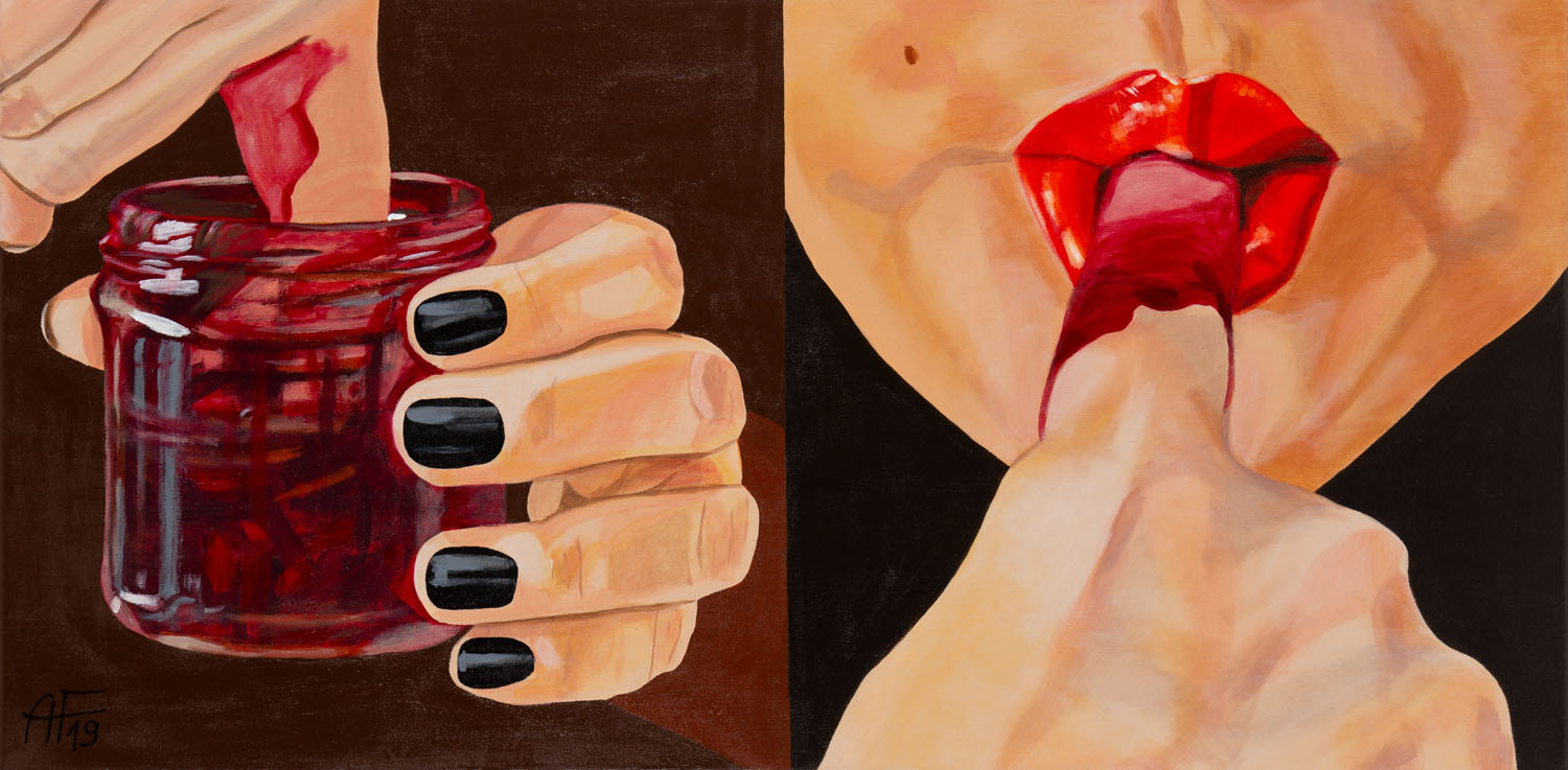 akryl/płótno, 50 x 100 cmsygnowany i datowany l.d.: 'AF 19'na odwrociu opisany: 'Anna Franczuk | "Konfitura wiśniowa" | Akryl na płótnie | 50 x 100 cm | 2019 r.'