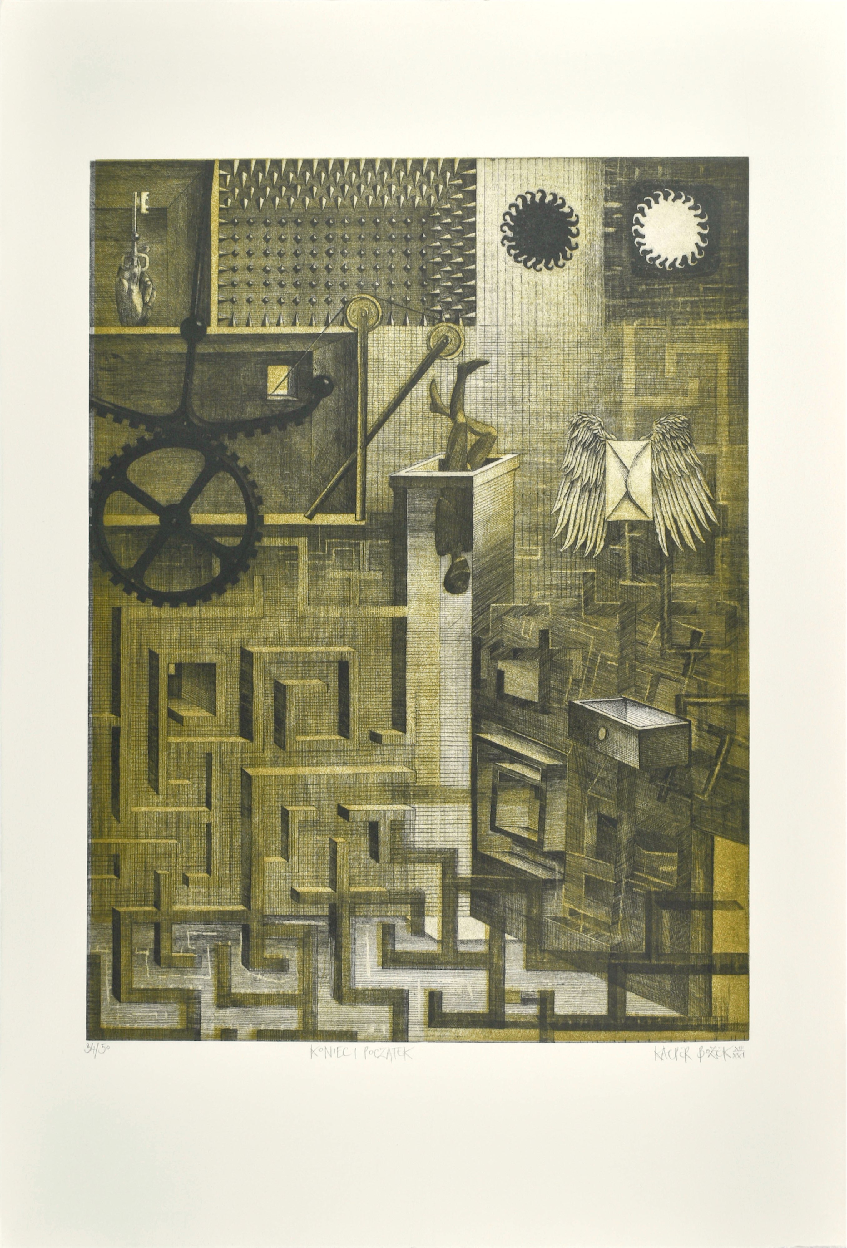 sygn. p. d.: KACPER BOŻEK XIII/XXI (ołówkiem), tytuł. śr. d.: KONIEC I POCZĄTEK (ołówkiem), numer. l. d.: 34/50 (ołówkiem).