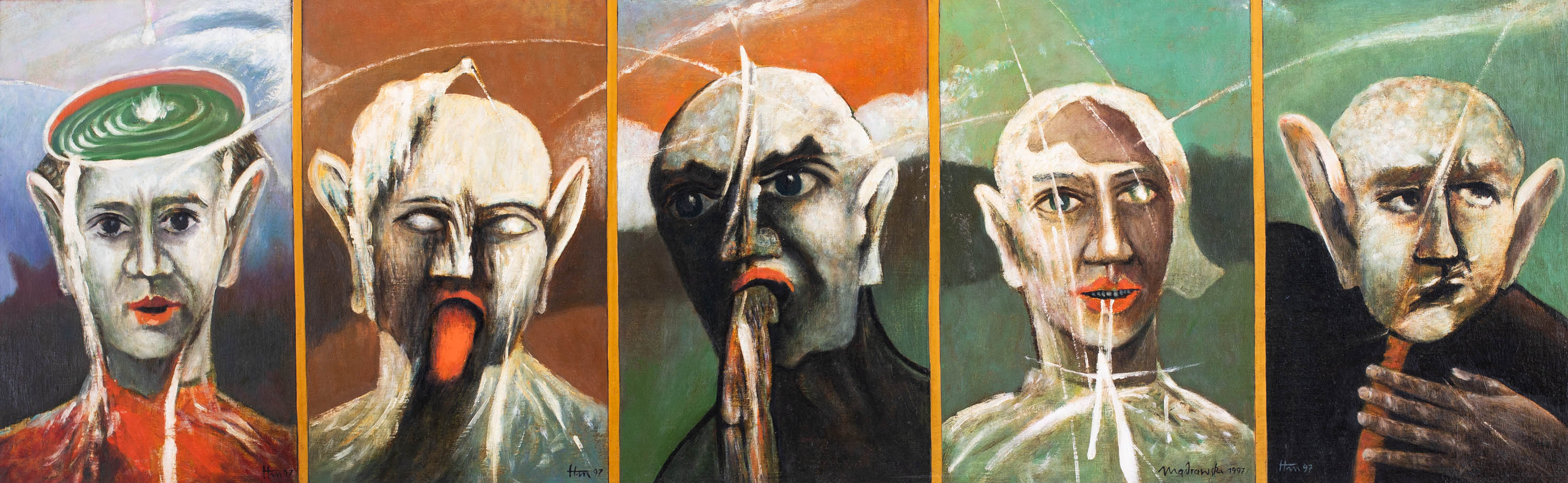 olej, deska, wym. 45 x 143 cmsygnowany na każdym panelu: Mądrawski 1997 / HM 97