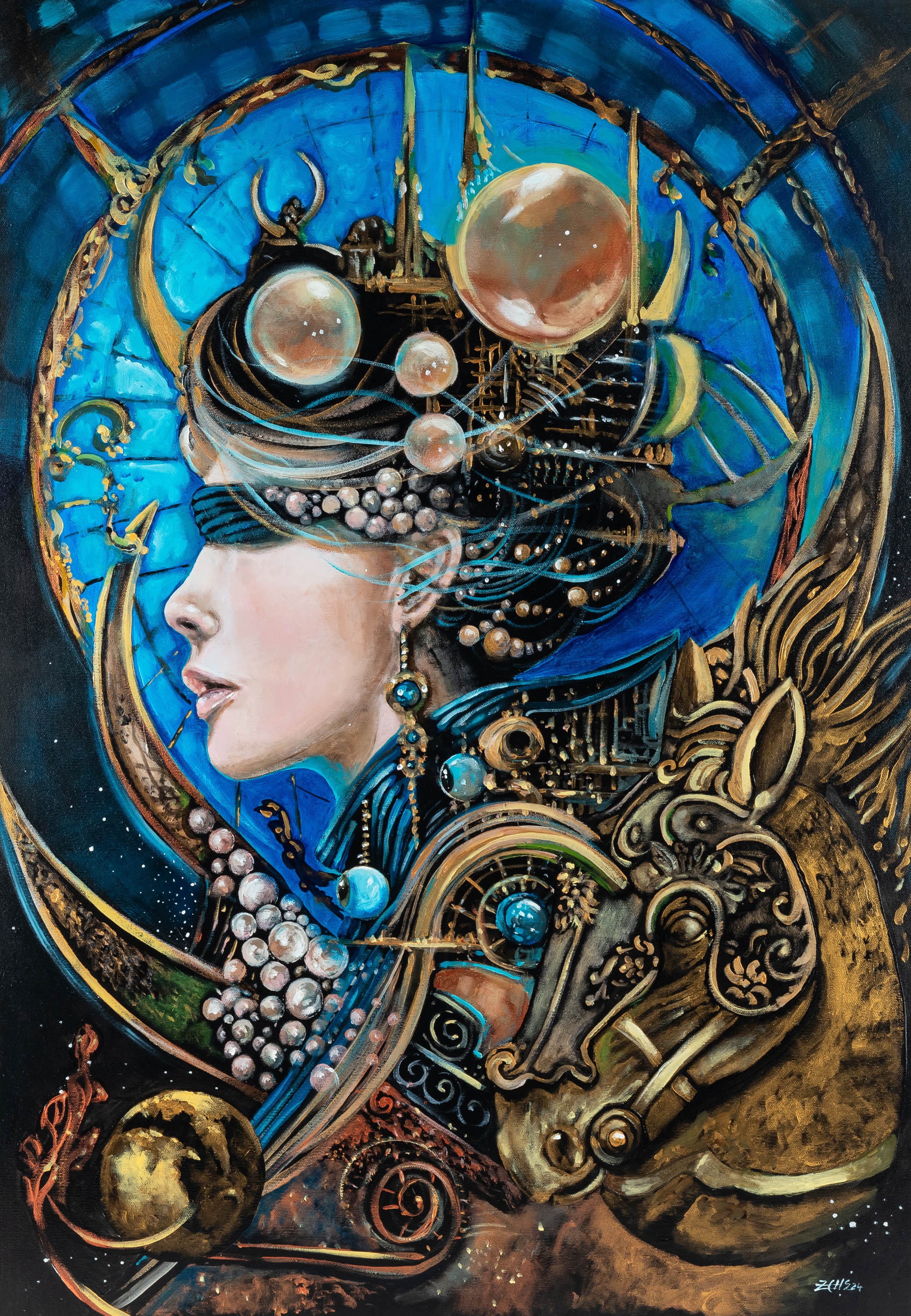 akryl, płótno, 100 x 70 cm,sygn., opisany i dat. na odwrocie: Żaneta Chłostowska / -Szwaczka / "Space construction" / acrylic, canvas, 100x70 cm, / 2024 / "Konstrukcja kosmosu"