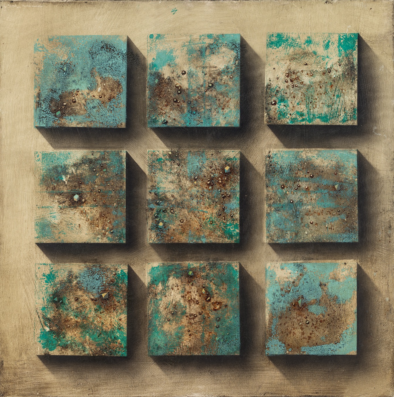 olej, płótno, 100 x 100 cm (w oprawie 117 x 117 cm),sygnowany l.g.: 'G. Klimek „Kopalnia minerałów” | 2013' oraz opisany na odwrocie: 'G. Klimek | „Kopalnia minerałów”'