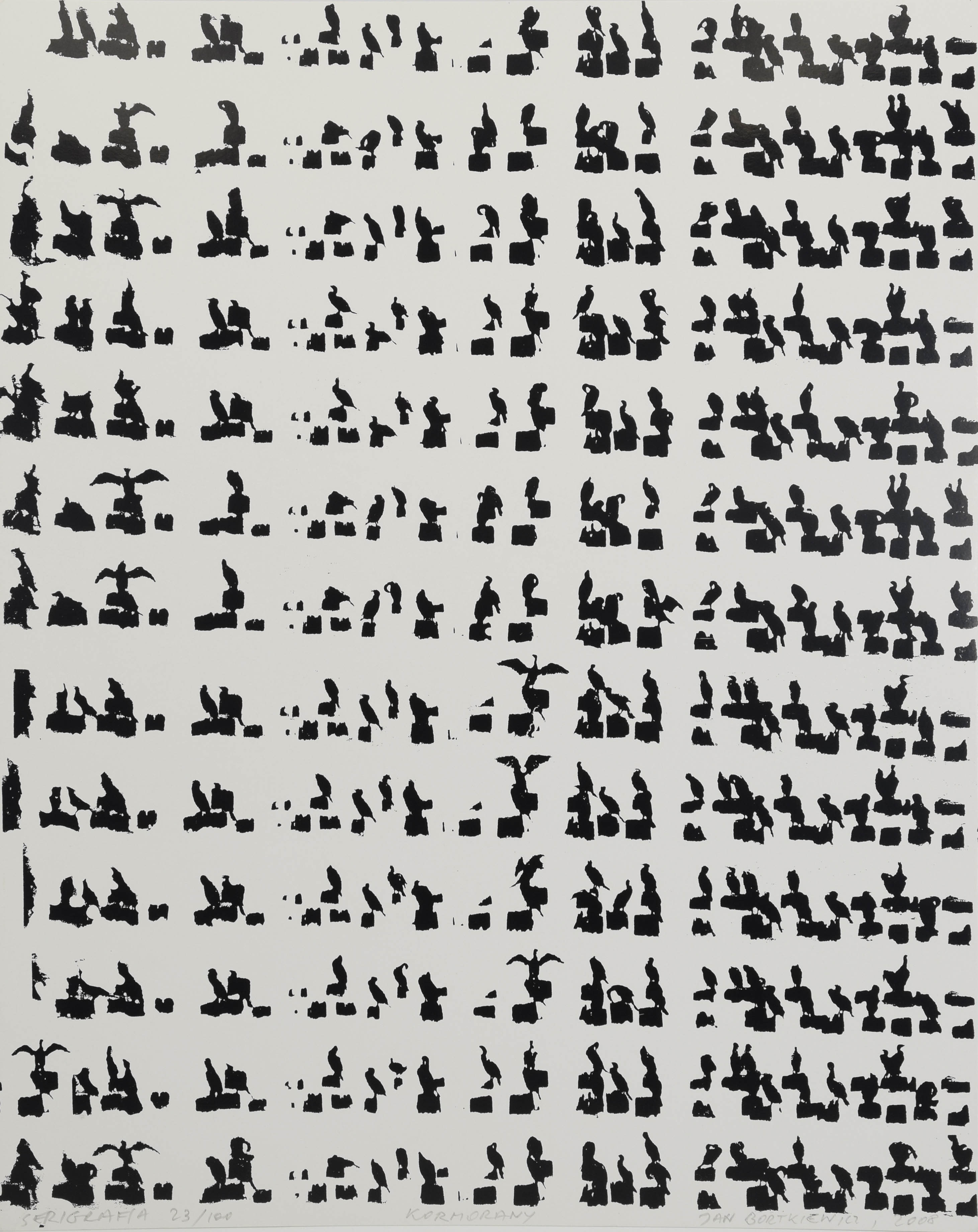 serigrafia, papier; 50 x 40 cm;opisana u dołu: SERIGRAFIA 23/100 / KORMORANY / JAN BORTKIEWICZ, 2008 (ołówkiem).