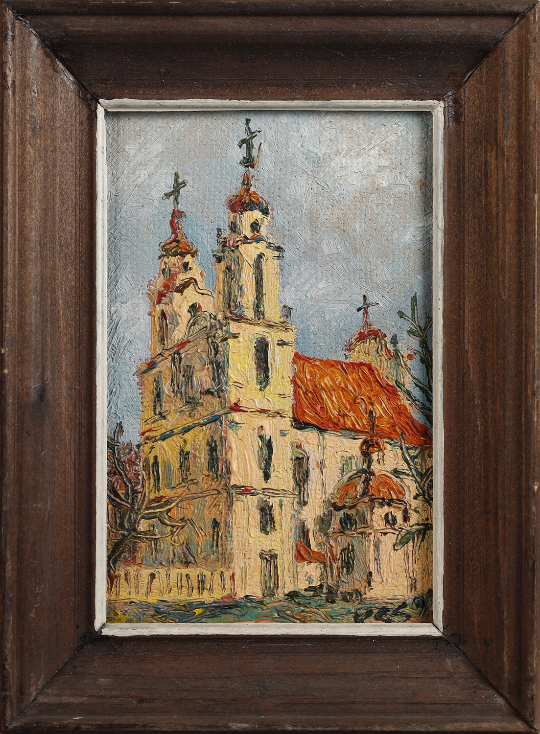 olej, płyta, 18 x 12 cm;sygn. p.d.: KSS93, opisany na odwrocie; S.KAPLEWSKI / 1993 / "Kość. Św. Katarzyny" / olej, pł. pilśniowa