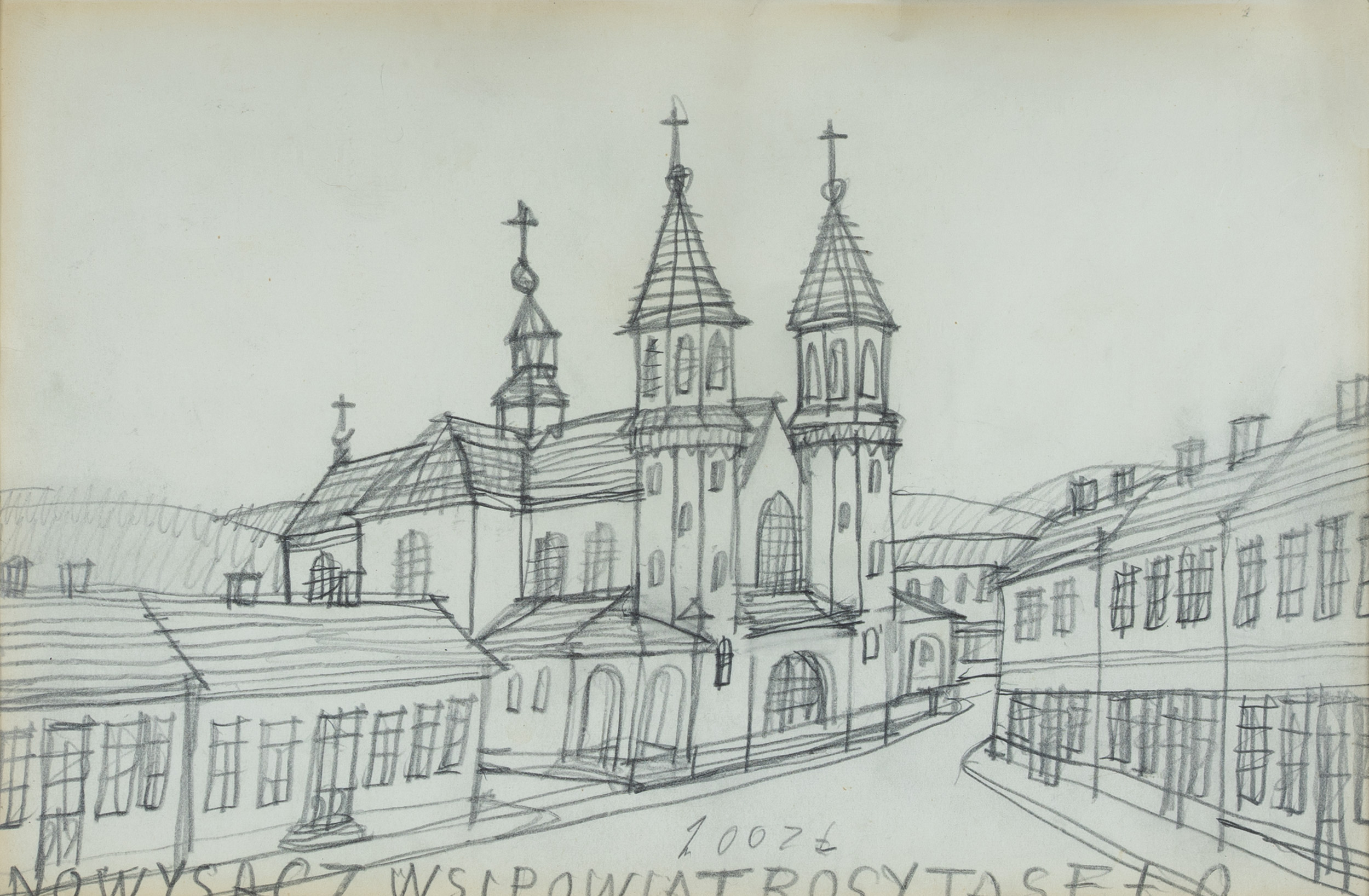 na odwrocie centralnie trzy pieczęcie: 1. okrągła: NIKIFOR, z napisem w otoku: MISTRZ Z KRYNICY; 2. dwukrotnie okrągła z przedstawieniem Nikifora Biskupa i napisem w otoku: PAMIĄTKA Z KRYNICY * NIKIFOR MALARZ *; poniżej ołówkiem: 70 - 000 ZŁ; przy górnej krawędzi (ołówek): K 4224, przy lewej krawędzi (ołówek): KT 1942B