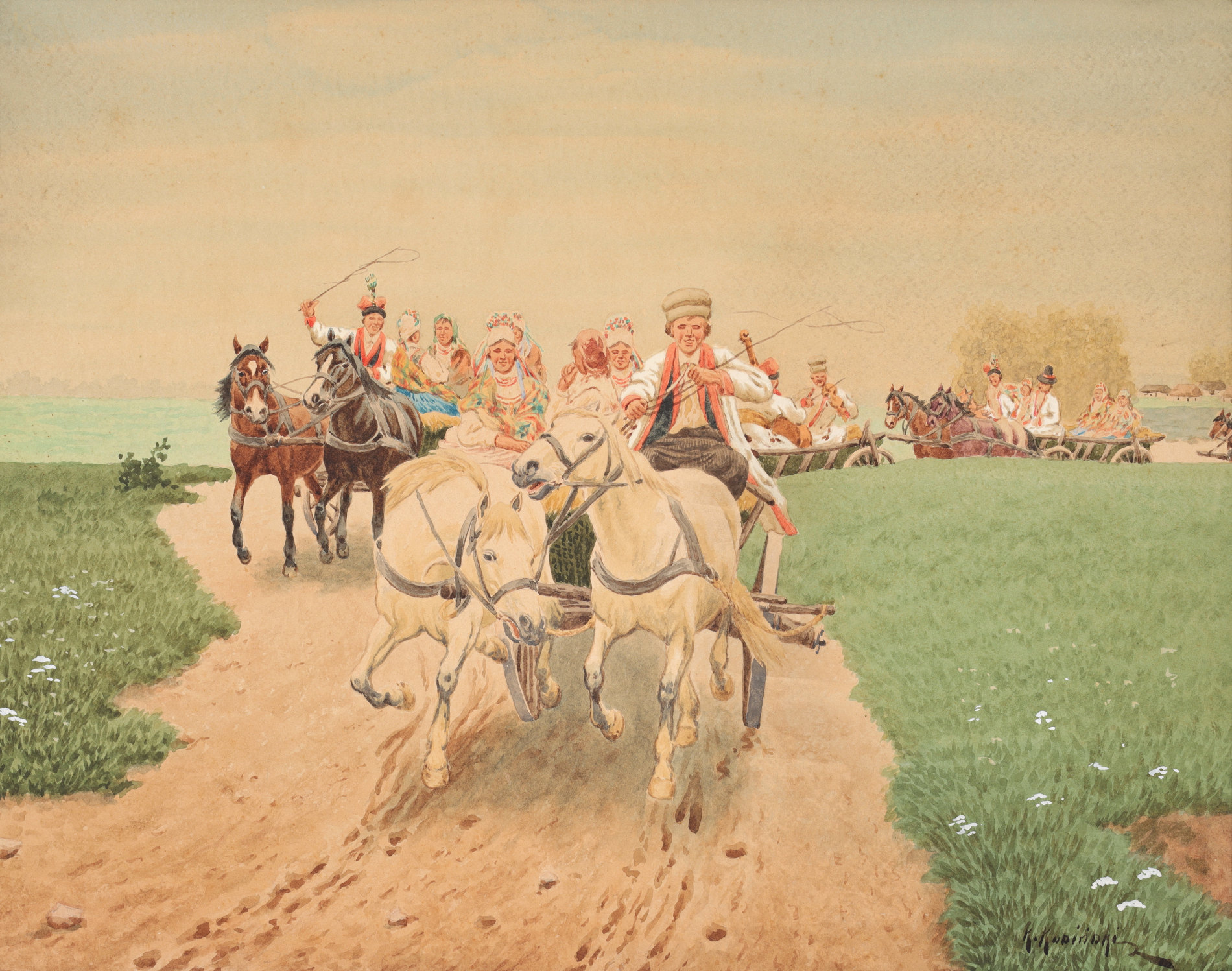akwarela, gwasz, papier naklejony na tekturę39 x 50,2 cm; 53,7 x 64,5 cm (z oprawą)Sygn. p.d.: "K. Kosiński"