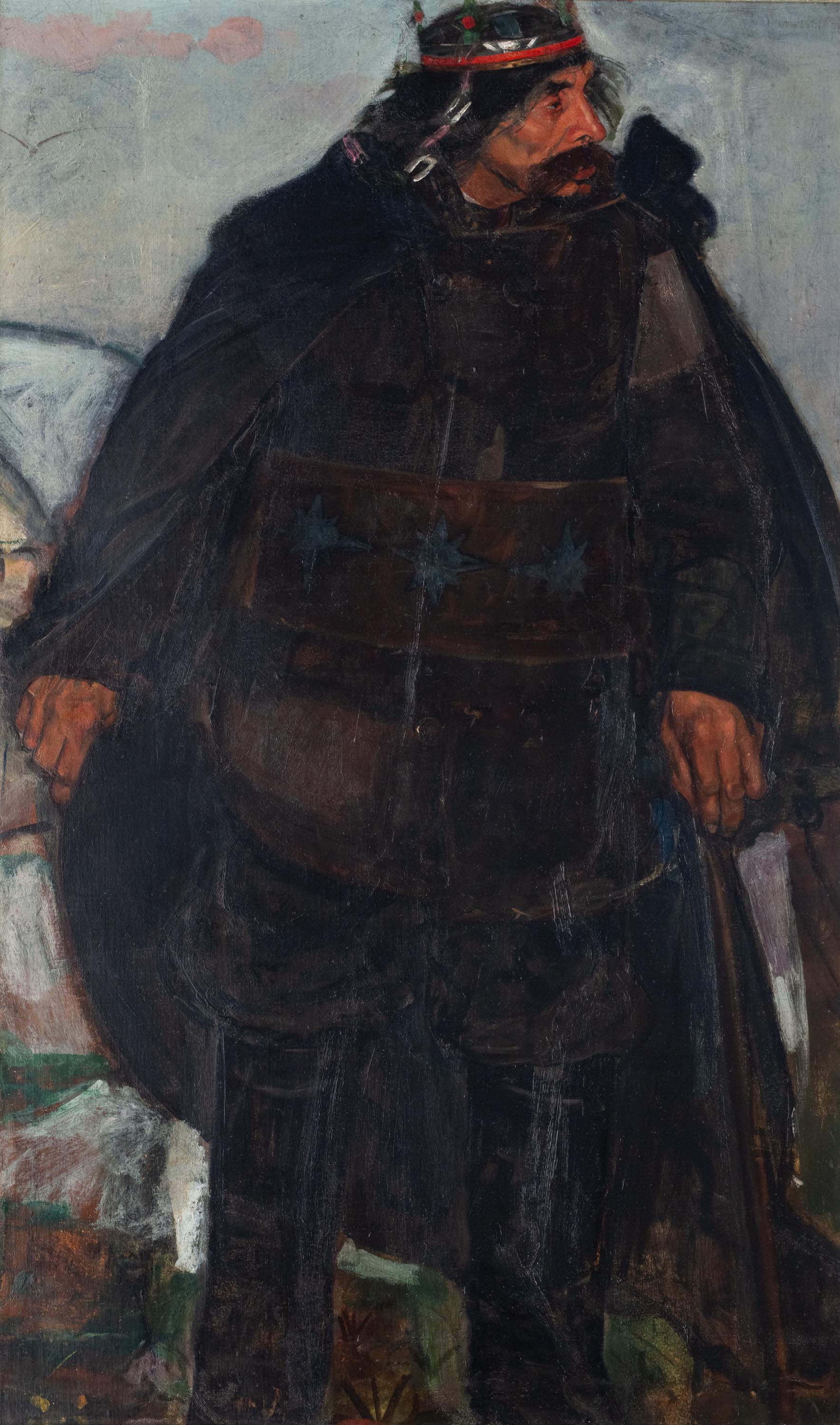 Obraz „Król”, sygnowany „Vlastimil Hofmann” najprawdopodobniej powstał w latach 1914–18. Artysta był wówczas w Pradze. W tym czasie malował obrazy w których tytuły i tematyka sugerują tęsknotę ich autora za „krajem nad Wisłą”. Były to np. „Złoty Wawel”, „Wizja nowej Polski”, „Tęsknota”. Hofman był również pełen nadziei na odrodzenie Polski po ustaniu konfliktu zbrojnego w Europie. Jako zwolennik symbolizmu Hofman wybierał do swych przedstawień postaci legendarne, odgrywające znaczącą rolę historyczną w świadomości społecznej. Niewykluczone, że portret króla to wizerunek mitycznego władcy Krakowa –Kraka, uznawanego również za twórcę państwowości polskiej. Wybierając taką legendarną postać Hofman mógł wzorować się na twórczości Mikoláša Aleša (1852–1913) – czeskiego malarza, grafika i rysownika, podejmującego w swych pracach tematy z odległej historii swojego kraju. Czeskie imię „Vlastimil” i niemiecko brzmiące nazwisko „Hofmann” przysporzyło artyście wiele problemów i niedomówień. Jak mówił sam o sobie: „Nazwisko mam niemieckie, imię czeskie. Nie jestem ani Niemcem, ani Czechem. Jestem Polakiem”. W 1918 roku, po sugestii swojego mistrza – Jacka Malczewskiego artysta spolszczył pisownię swojego imienia z Vlastimil na Wlastimil, a następnie z nazwiska usunął jedną literę „n”. Na decyzję artysty wpłynęło również „spotkanie w czasie I wojny światowej z czeskim malarzem i architektem, późniejszym dyrektorem Teatru Narodowego w Pradze, Vlastislawem Hofmanem (1884–1964). Ponieważ obu artystów nieustannie mylono na wystawach, polski malarz za namową przyjaciela, czeskiego poety Jerzego Karáska, spolszczył imię i od 1918 roku zaczął podpisywać się jako Wlastimil, tak też sygnował obrazy. Szukając informacji na temat malarza w archiwach czeskich, można zauważyć, iż mylono Wlastimila Hofmana nie tylko z Vlastislawem Hofmanem, lecz także – co gorsza – z jego dalekim kuzynem (malarzem, ilustratorem książek oraz autorem wielu exlibrisów) o takim samym imieniu i nazwisku, czyli drugim Vlastimilem Hofmanem. Wobec takich okoliczności decyzja artysty o zmianie pisowni imienia była trafna” (B.Mielczarek, Hofmann czy Hofman? Krótka historia pisowni imienia i nazwiska Wlastimila Hofman, źródło: niezlasztuka.net). O zmianie pisowni wspominał sam Wlastimil w swoim pamiętniku: „Podpisuję się obecnie na obrazach przez „W” a nie przez „V”. Poszedłem za radą Karáska ze Lvovic, z którym razem byliśmy w Pradze, gdzie na wystawie ekspresjonistów czeskich pokazywał swoje prace architekt Vlastislav Hofmann, podpisuje się „Vlast. H”. i to pismem bardzo do mnie podobnym” (cyt. za: Elżbieta Wolniewicz-Mierzwińska ,„Sylwetka Wlastimila Hofmana w świetle jego pamiętnika”, w: „Biuletyn Historii Sztuki”, Warszawa 1979, nr 3, s. 269)
