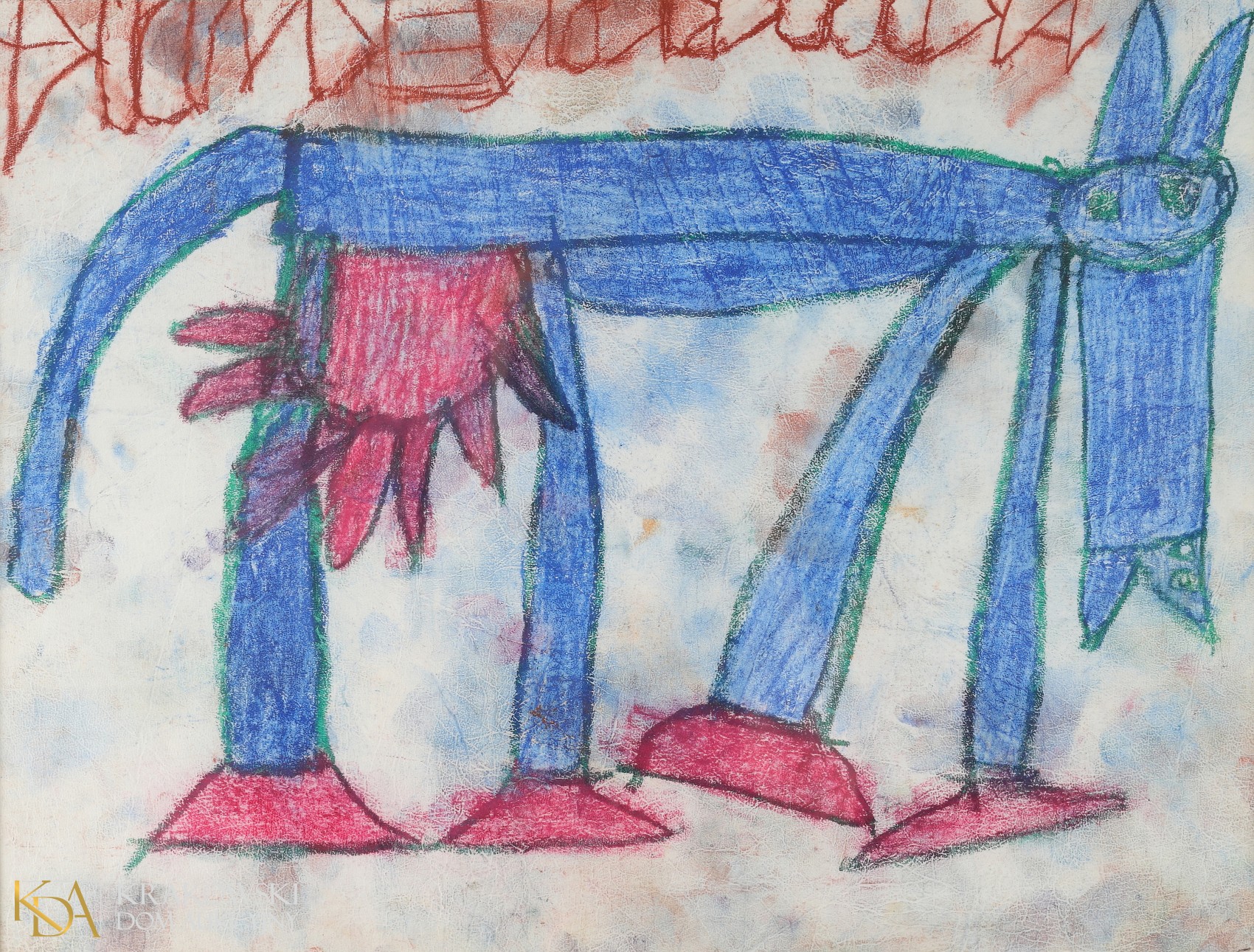 pastel olejny, materiał skóropodobny, 34 x 44,5 cm (w świetle oprawy), opis autorski śr.g.Na odwrocie metka z Pracowni plastycznej Domu Pomocy Społecznej w Brwilnie z opisem obrazu.