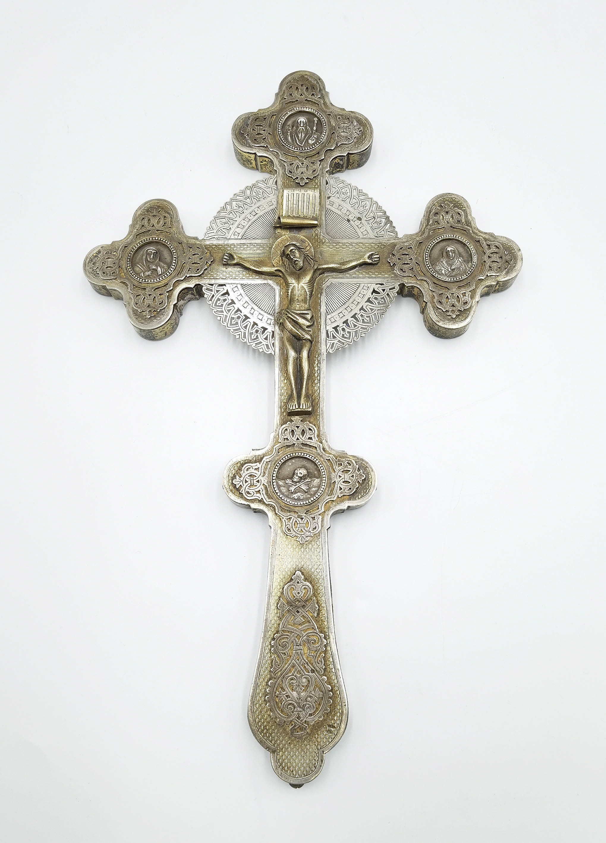 Krzyż z rozpiętą figurką Chrystusa; zakończenia ramion trójlistne z nakładanymi ażurowymi plakietkami z kolistymi medalionami obrzeżonymi perełkowaniem, z przedstawieniami Boga Ojca w zwieńczeniu, Matki Bożej i św. Jana na końcach belki poprzecznej oraz czaszką u dołu, ujętymi w ornament z przeplatających się dekoracyjnie taśm; na rewersie grawerowana dekoracja ze splątanych taśm na tle giloszowanym, na belce poprzecznej grawerowany napis cyrylicą
