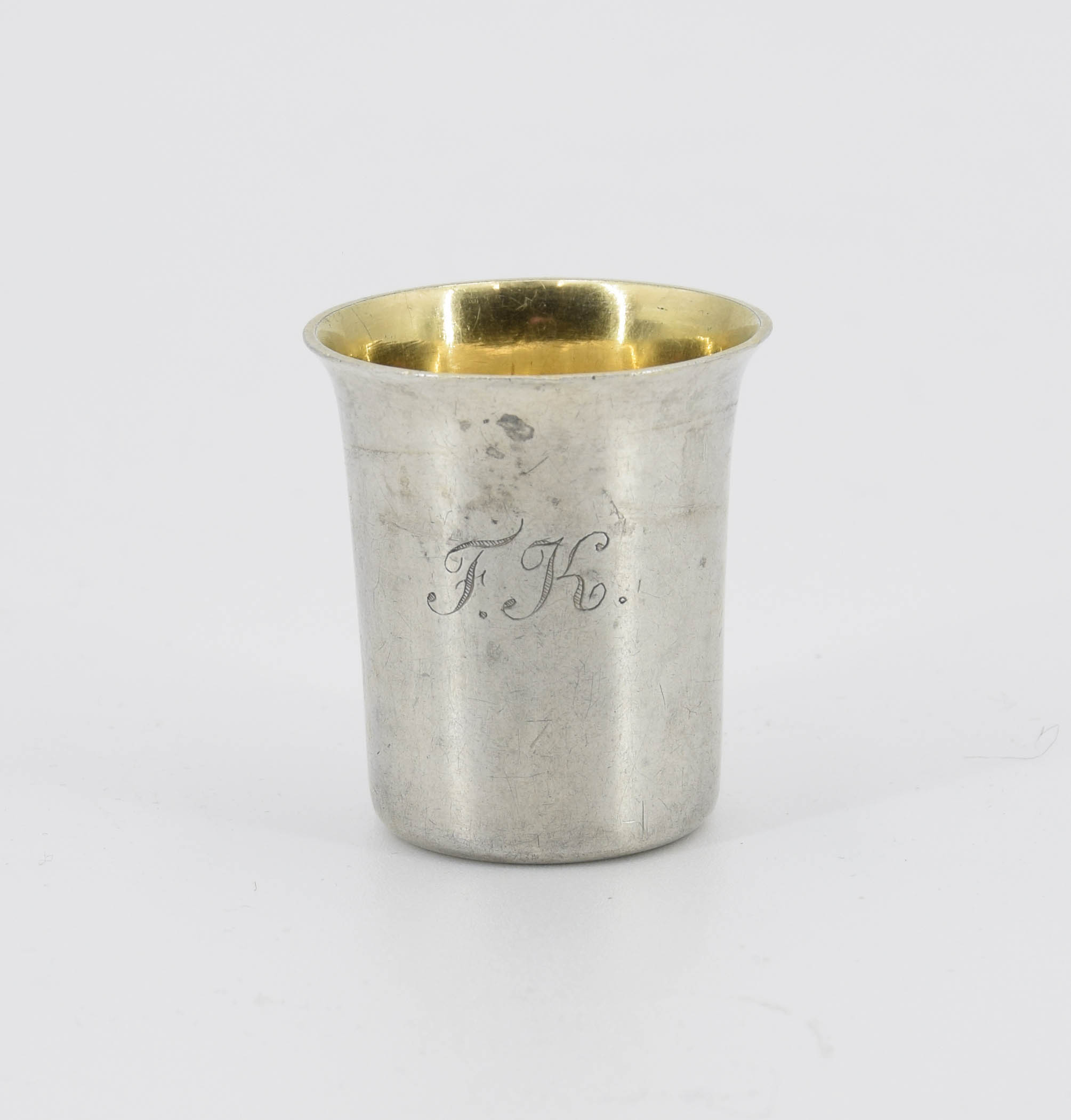 Kubeczek gładki, koniczny, o rozchylonej krawędzi i złoconym wnętrzu; na płaszczu grawerowane inicjały F.K.