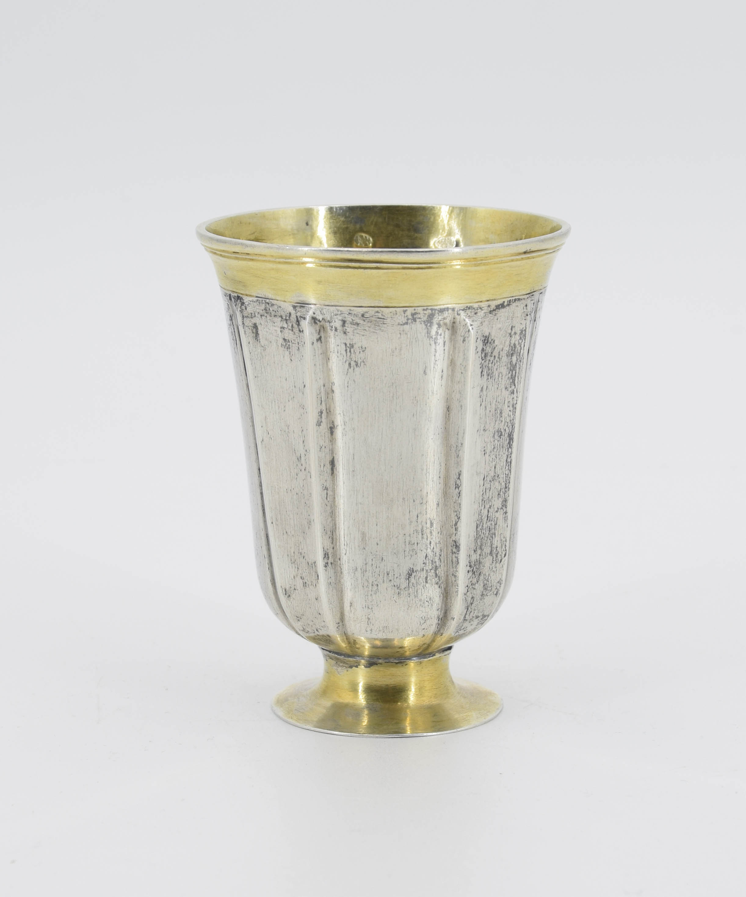 Kubek na małej, płaskiej stopie, na planie koła, rozszerzający się ku górze, z rozchyloną, profilowaną górną krawędzią, zdobioną pasem złocenia; korpus dekorowany pionowo biegnącymi kanelami.