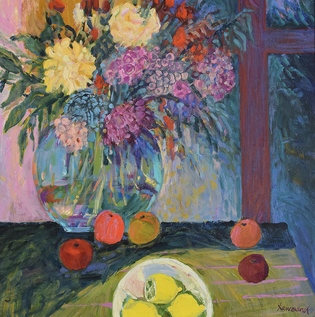 olej, płótno; 70 x 70 cm;sygn. p. d.: Xancenbach;opis autorski na odwrocie: JAN SZANCENBACH / KWIATY / 1995.